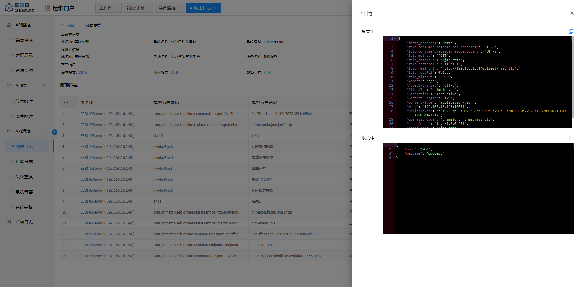 点击菜单“API运维”>"调用日志",进入“调用日志”页面。
