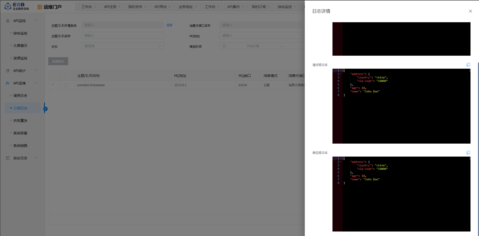 点击菜单“API运维”>"订阅日志",进入“订阅日志”页面。