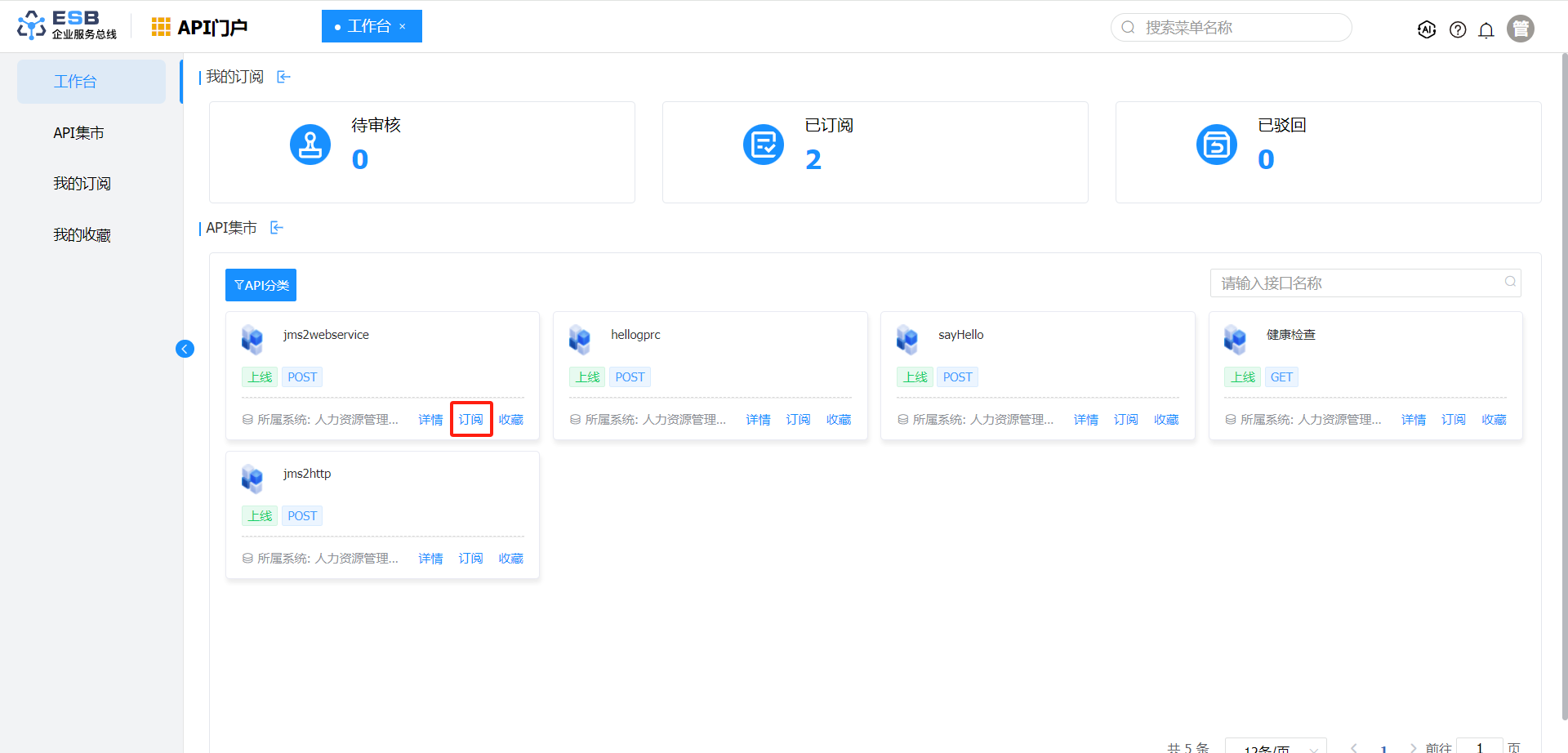 2.在“API集市”页签,查看已发布的接口,点击”订阅”,申请订阅接口。