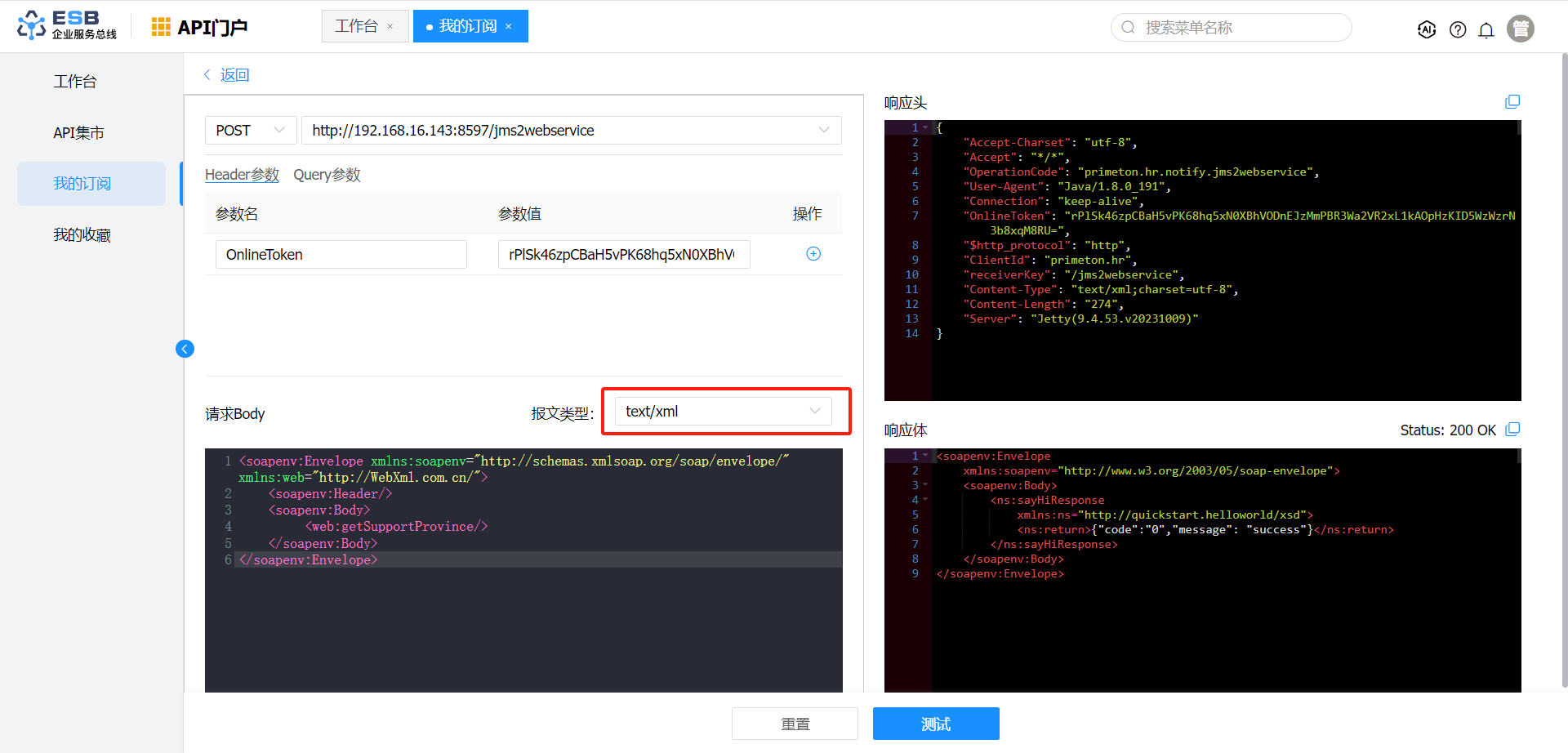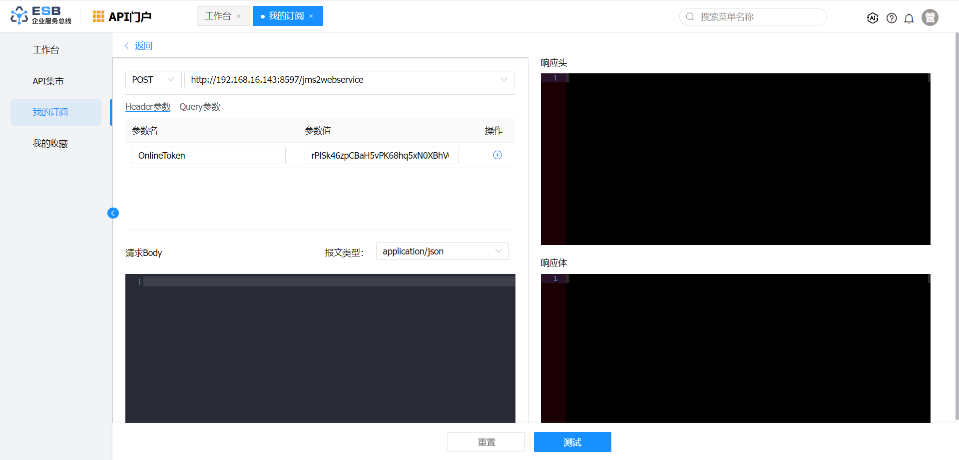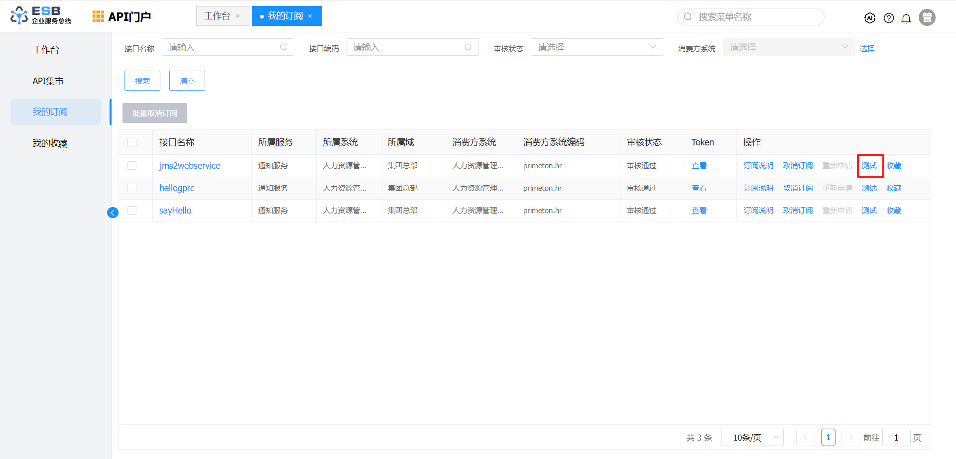 3.在“我的订阅”页面,查看已订阅的接口,点击“测试”按钮,进入接口测试页面。