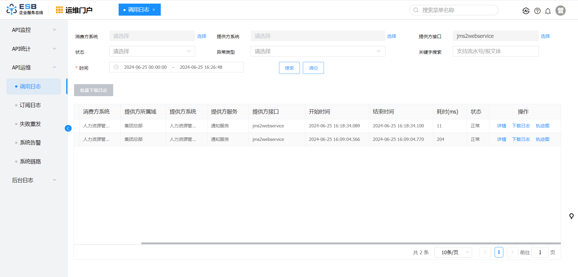 2. 点击菜单“API运维”>"调用日志",进入“调用日志”页面。