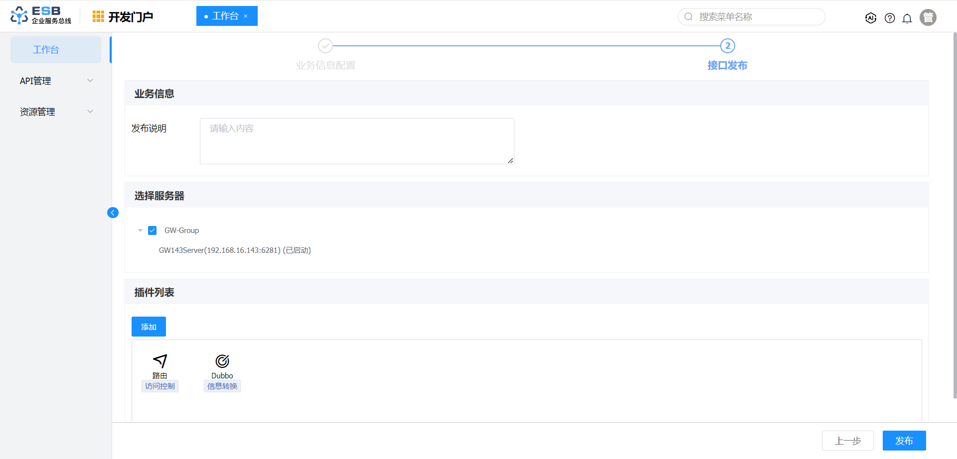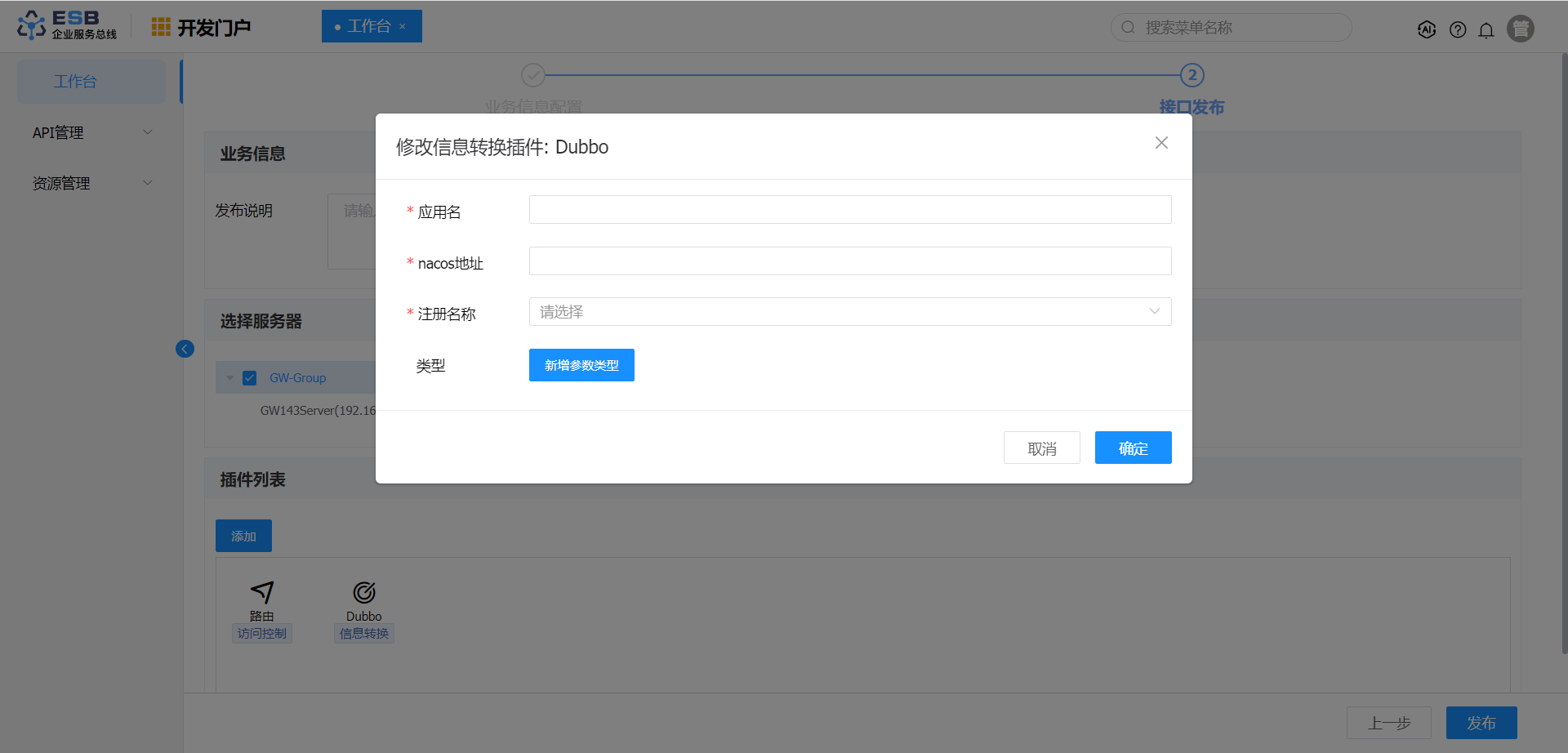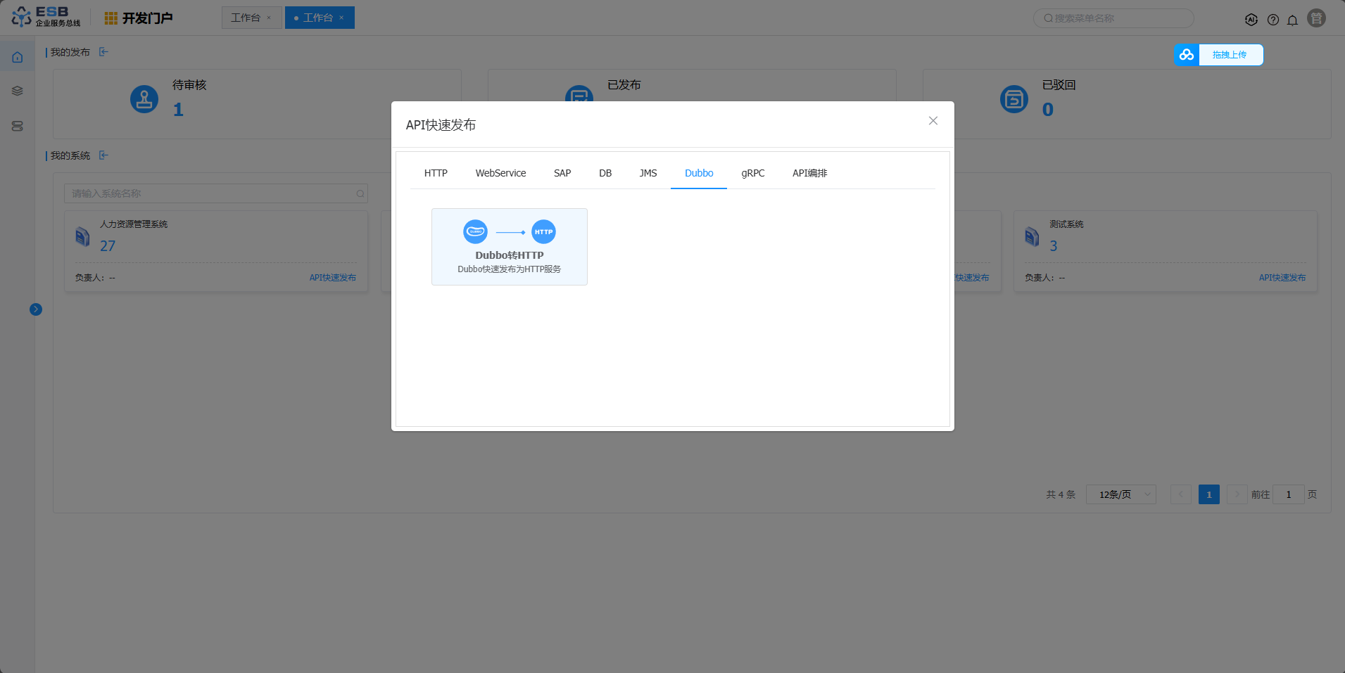 3.“API快速发布“弹窗,选择”Dubbo“页签,点击”Dubbo转HTTP“按钮,进入”Dubbo转HTTP“接口发布页面。