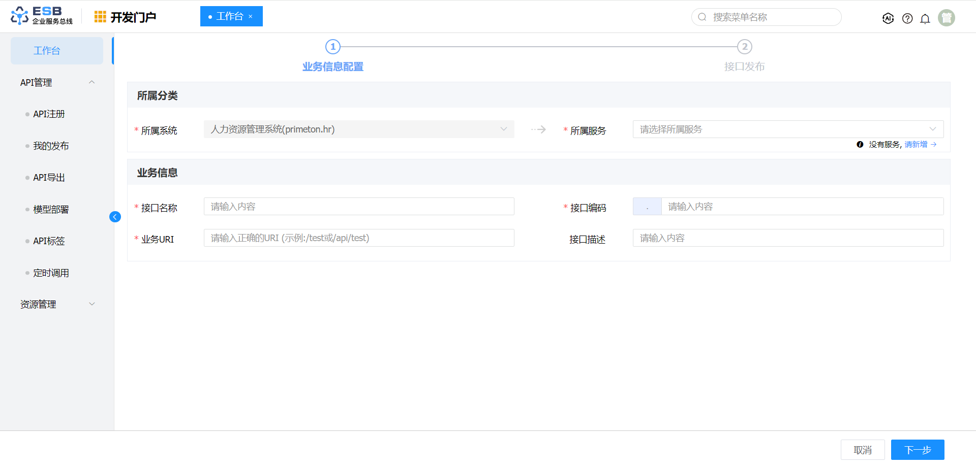 2.“工作台”页面,在“我的系统”页签中,点击系统卡片上的“API快速发布“按钮,弹出“API快速发布“弹窗。