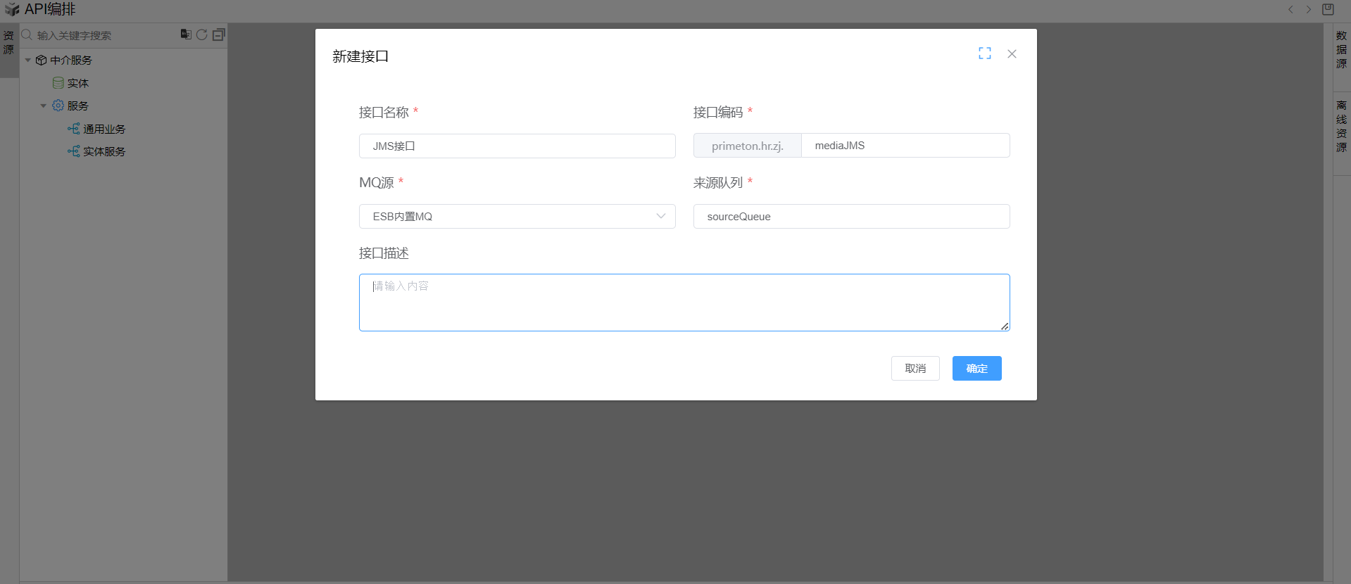 在线编排页面中的通用业务目录上点击右键,点击新建并点击新建JMS接口,然后如下图所示填写数据,并点击保存确定。