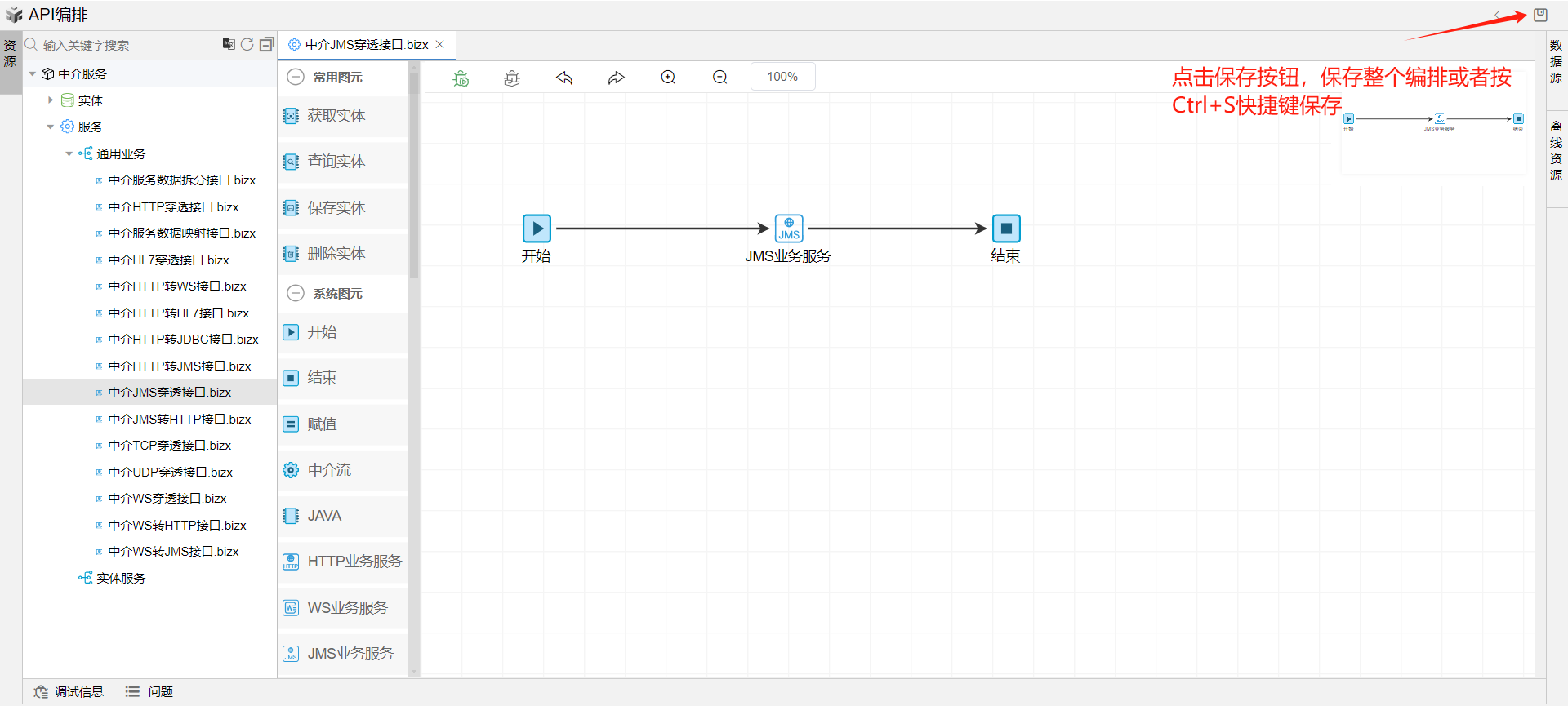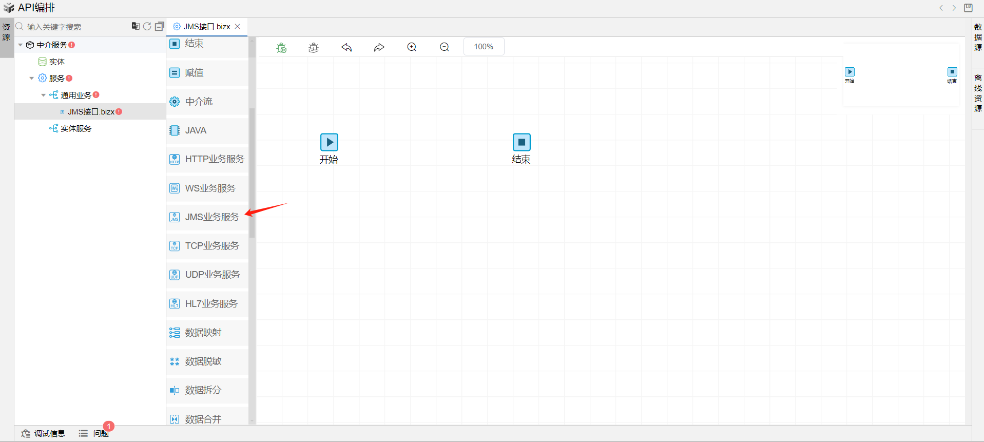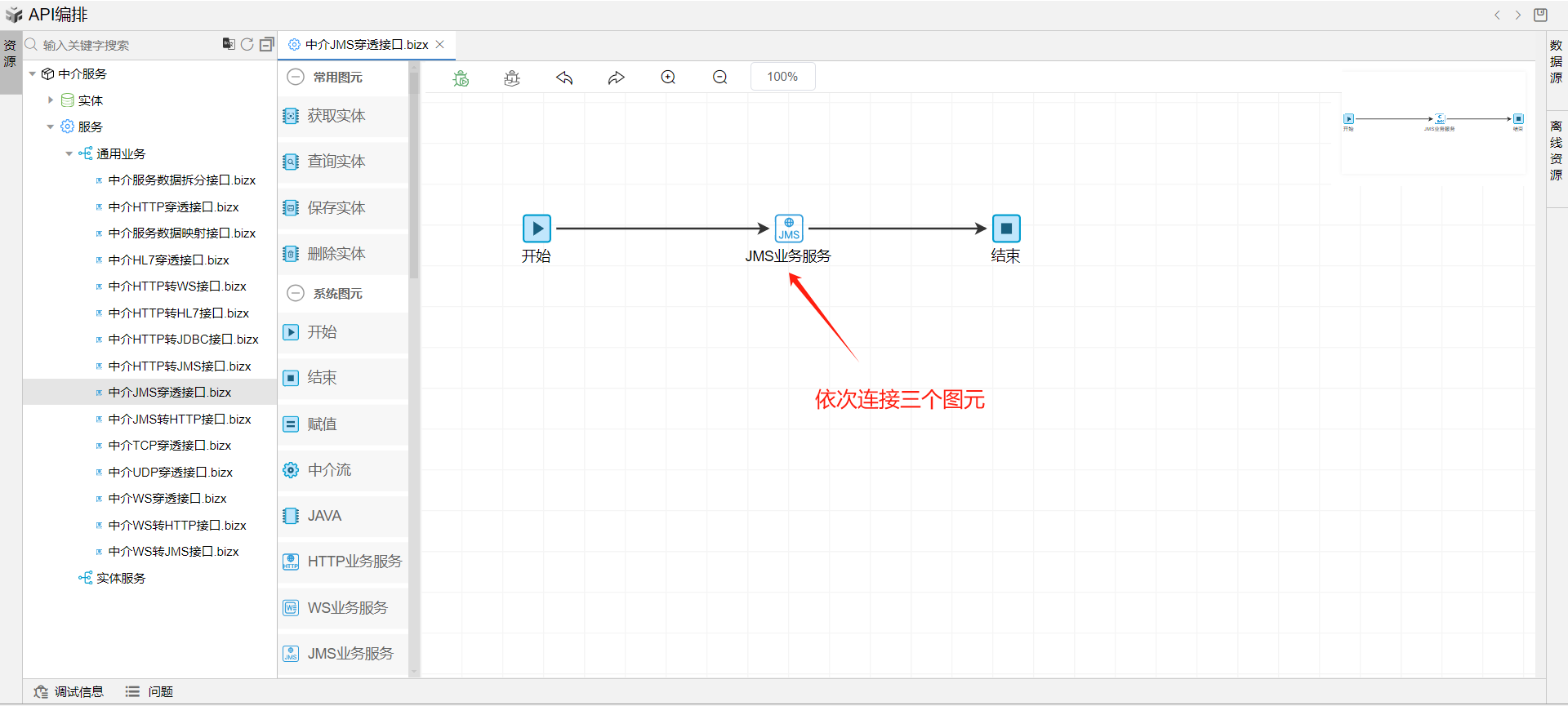 保存成功后系统自动打开中介编排页面。从左侧拖一个JMS业务服务图元到开始和结束图元中间,并依次连接各个图元。如下图: