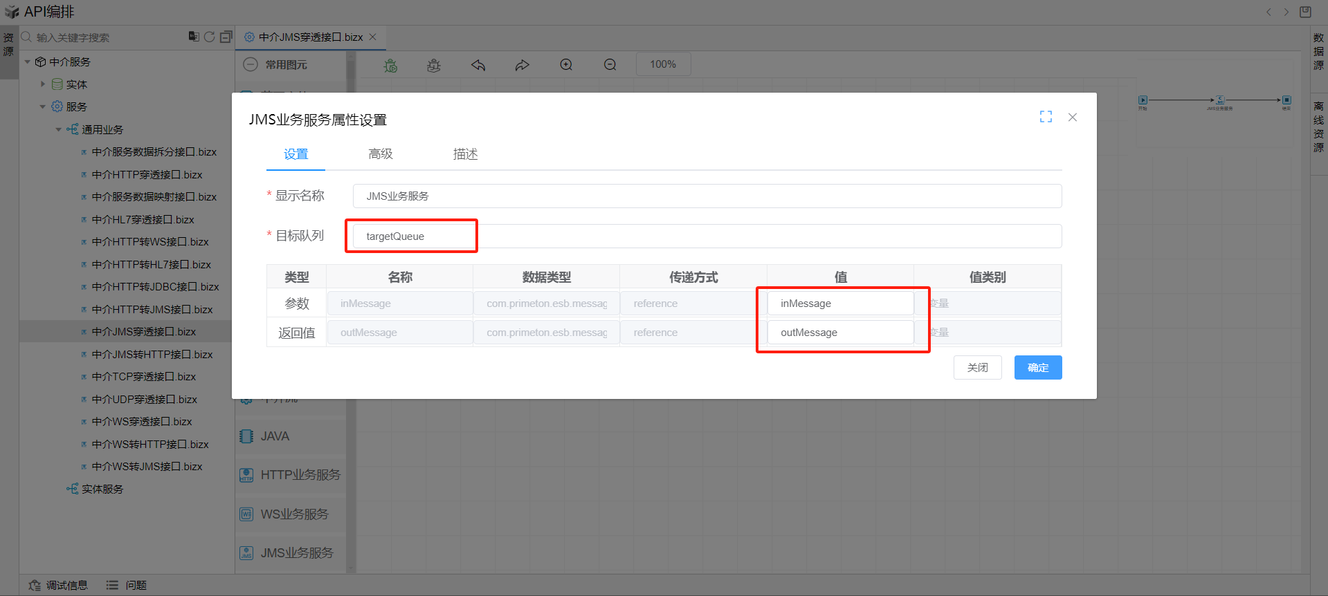 双击打开JMS业务服务图元,填写目标队列名称,下方表格中的参数和返回值分别选择inMessage和outMessage,然后点击确定按钮关闭对话框。如下图: