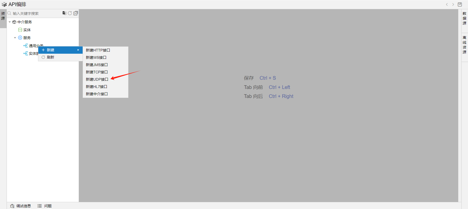 2. 在线编排页面中的通用业务目录上点击右键,点击新建并点击新建UDP接口,然后如下图所示填写数据,并点击保存确定。