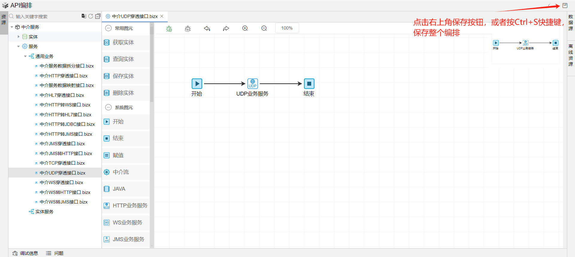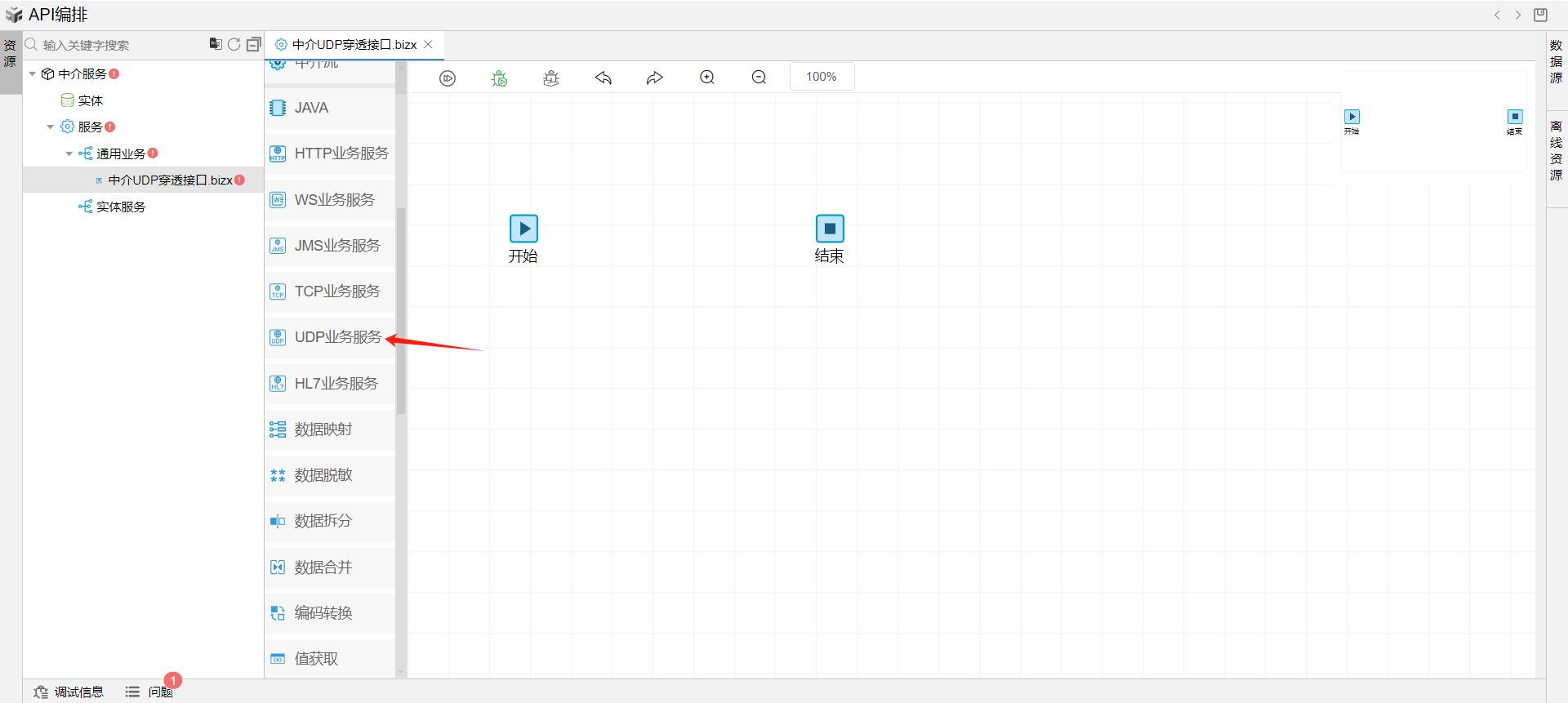 1. 保存成功后系统自动打开中介编排页面,如下图所示。从左侧拖一个UDP业务服务图元到开始和结束图元中间,并依次连接各个图元。如下图: