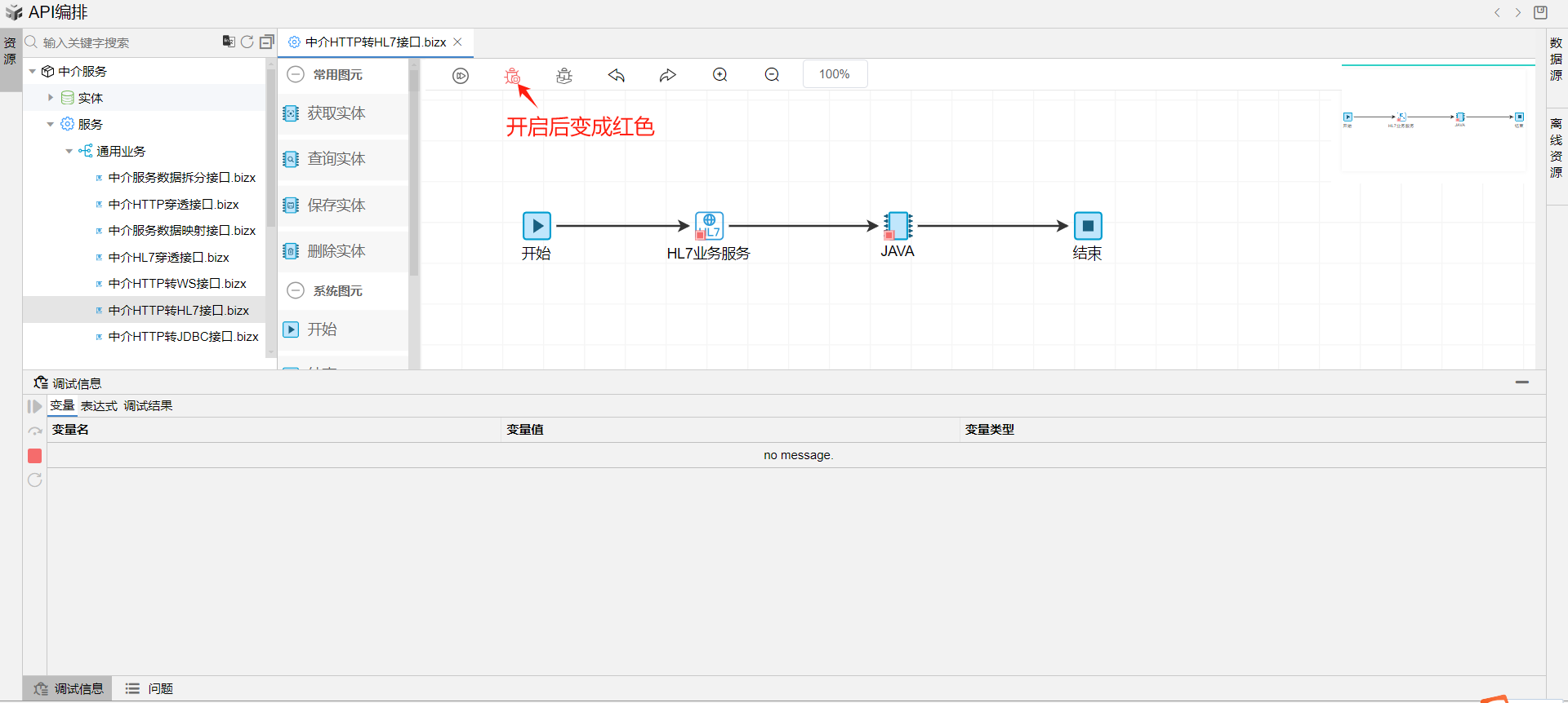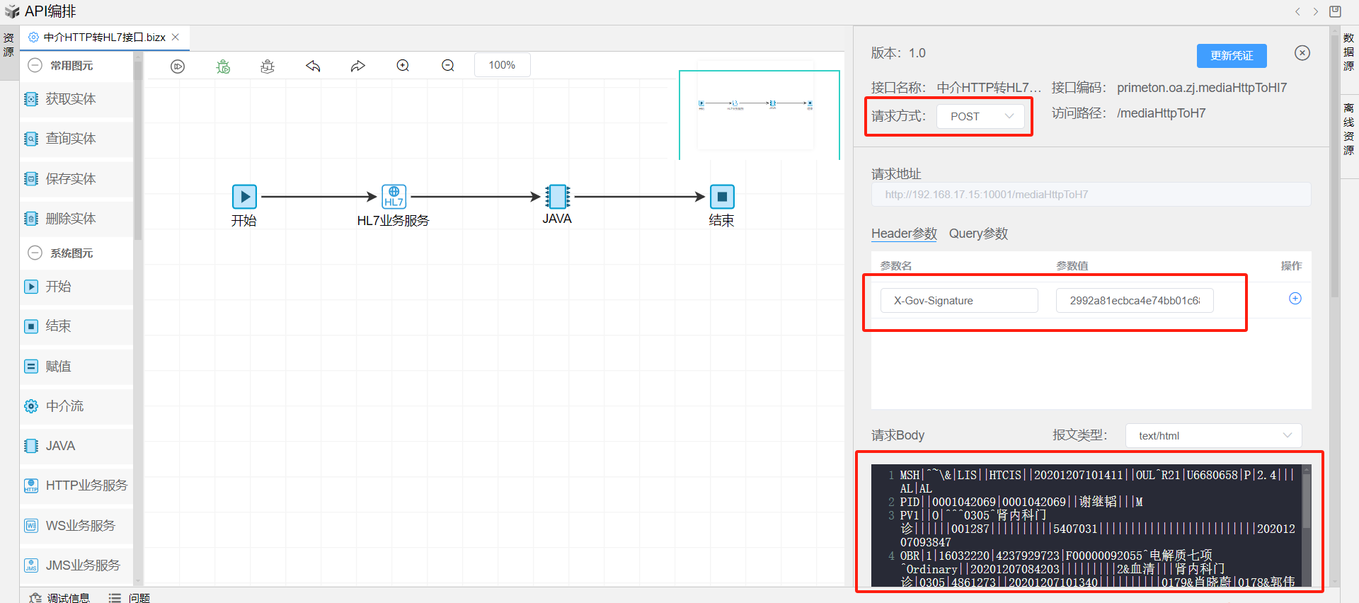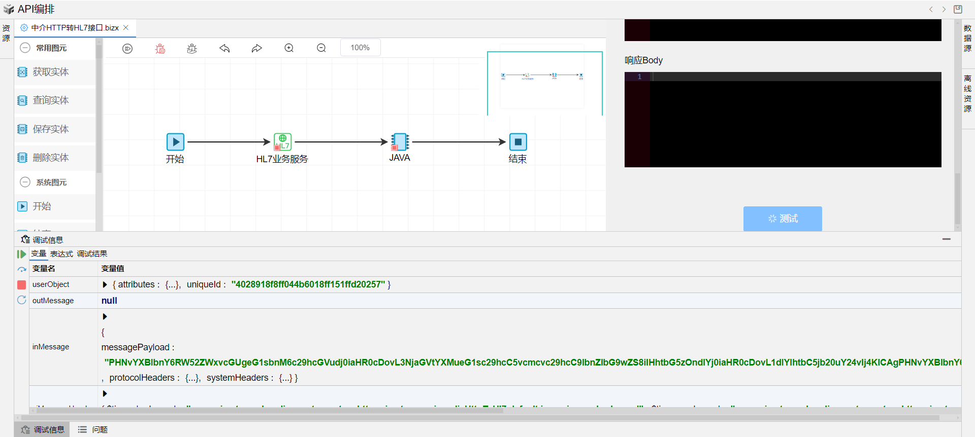 2. 在左侧树,服务-通用业务下,点击中介HTTP转HL7接口.bizx,右侧打开对应编排页面。如下图: