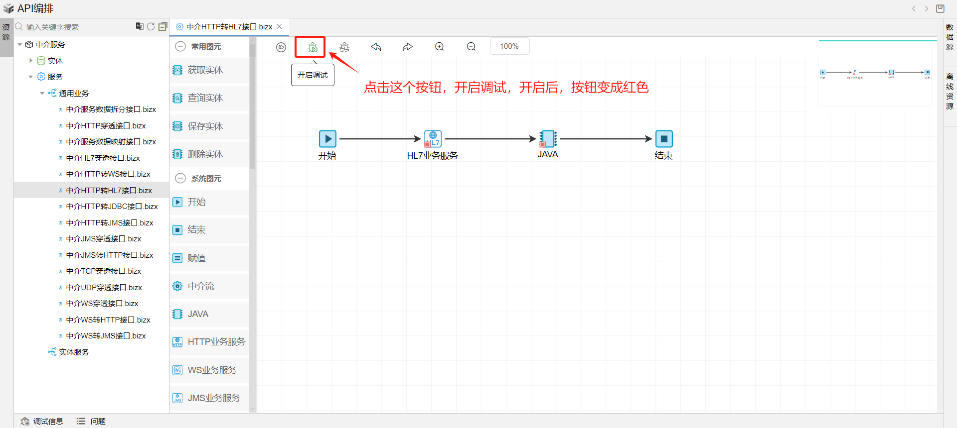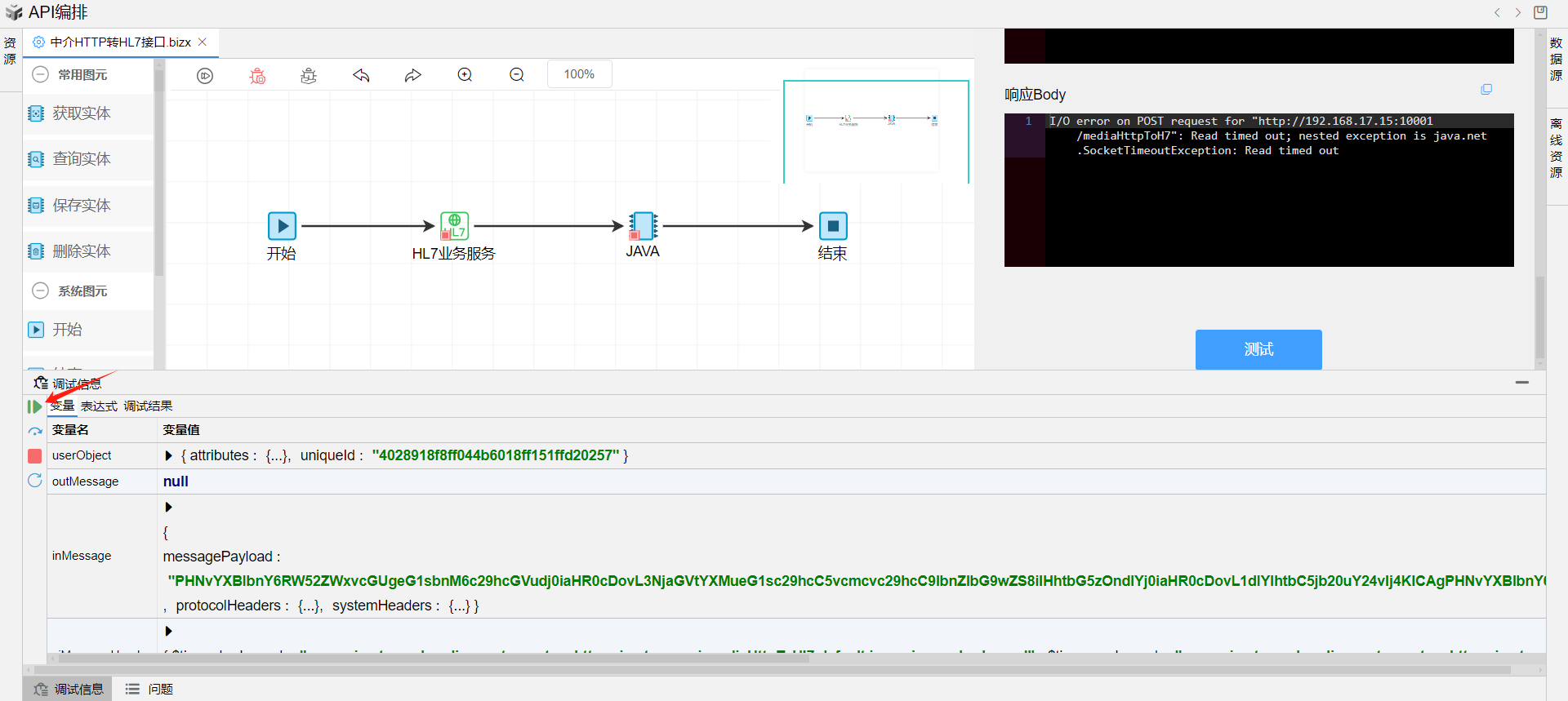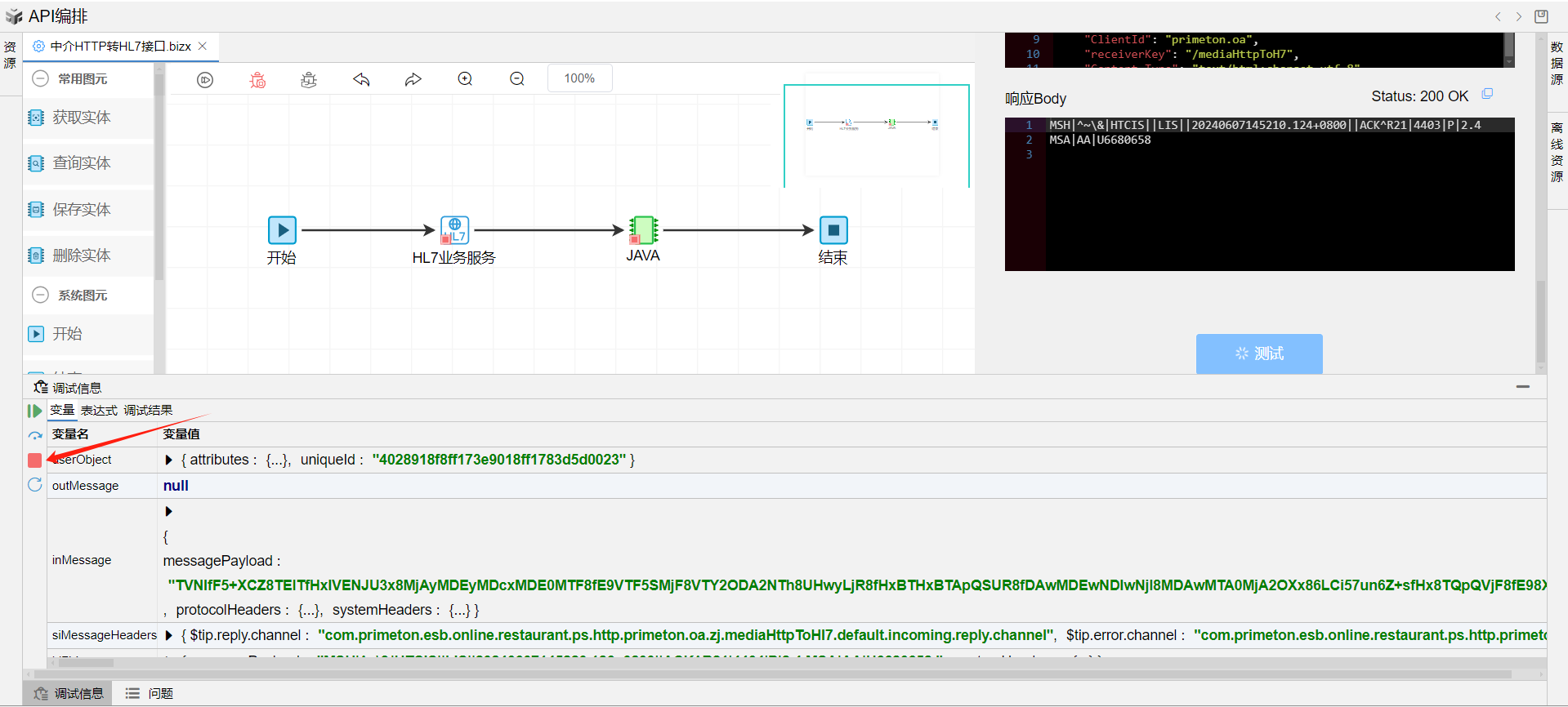 2. 在左侧树,服务-通用业务下,点击中介HTTP转HL7接口.bizx,右侧打开对应编排页面。如下图: