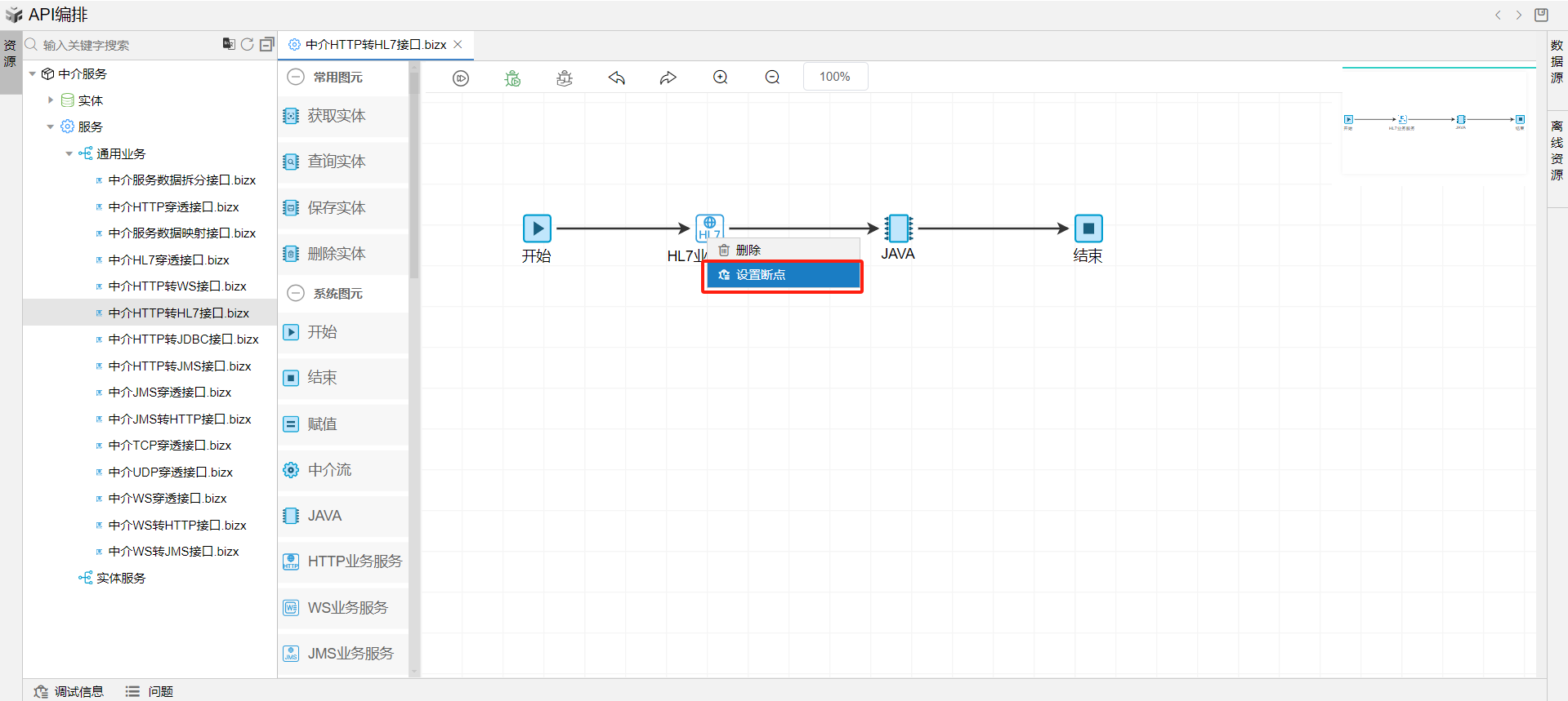 3. 在HL7业务服务图元上点击鼠标右键,点击设置断点。在JAVA图元上面点击鼠标右键,点击设置断点。如图: