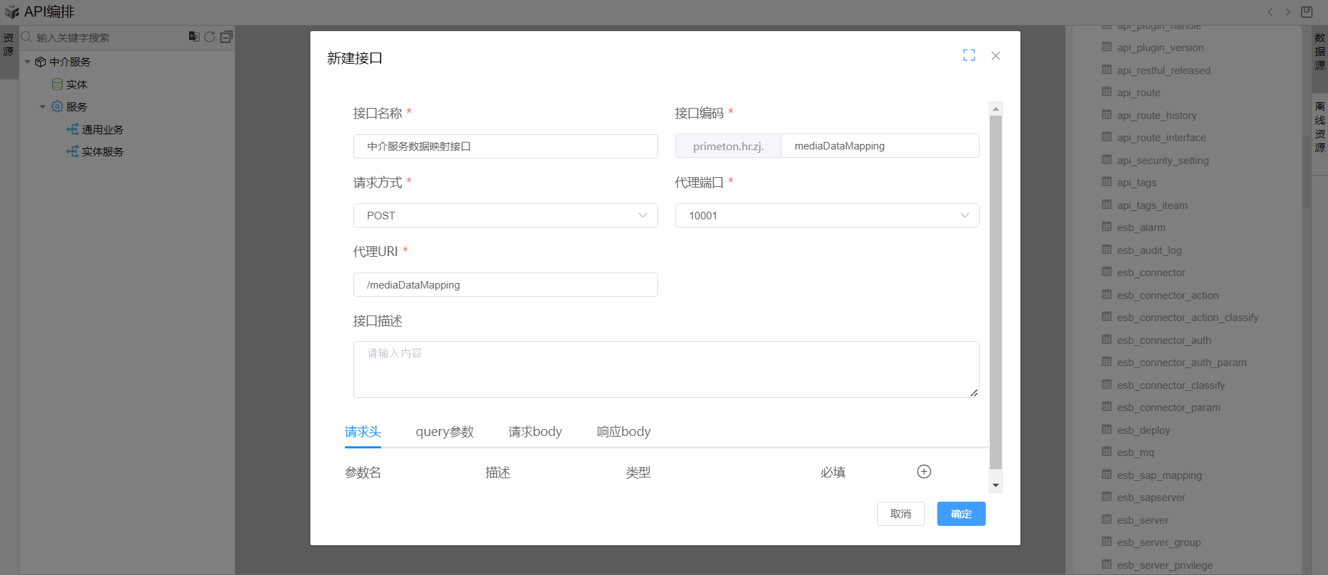 1. 选择左侧树上中介服务节点,点击右侧的API创建按钮,选择”API编排“页签,点击”API编排“按钮,进入在线编排页面。