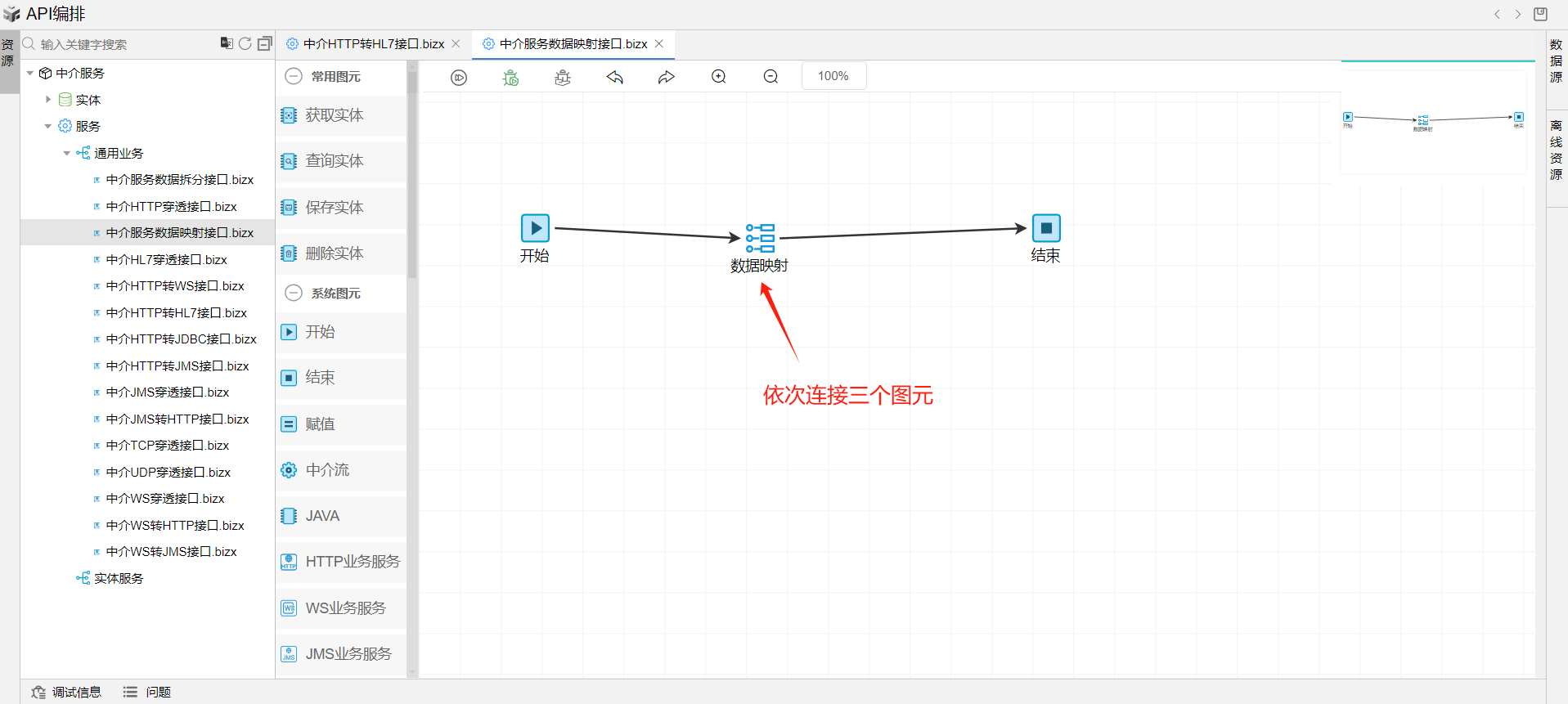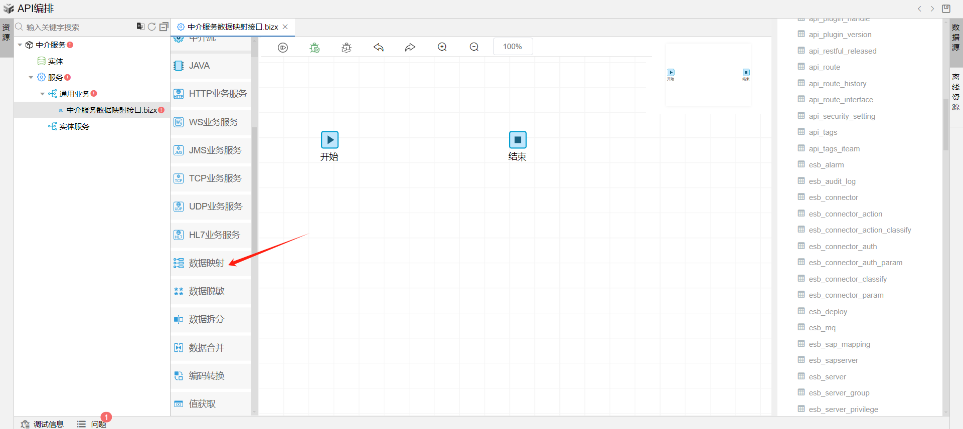 1. 保存成功后系统自动打开中介编排页面。从左侧拖一个数据映射图元到开始和结束中间,并依次连接各个图元。如下图: