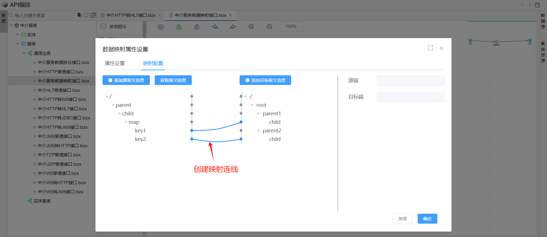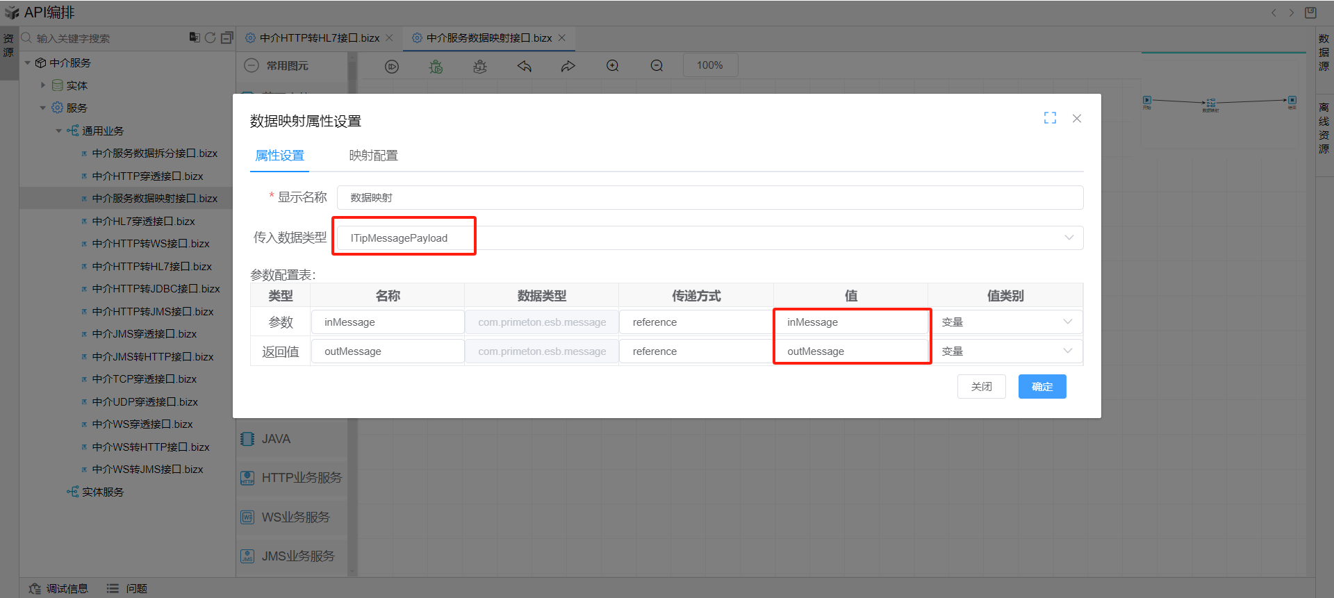 2. 双击打开数据映射图元,在属性设置tab页,填写参数和返回值。如下图: