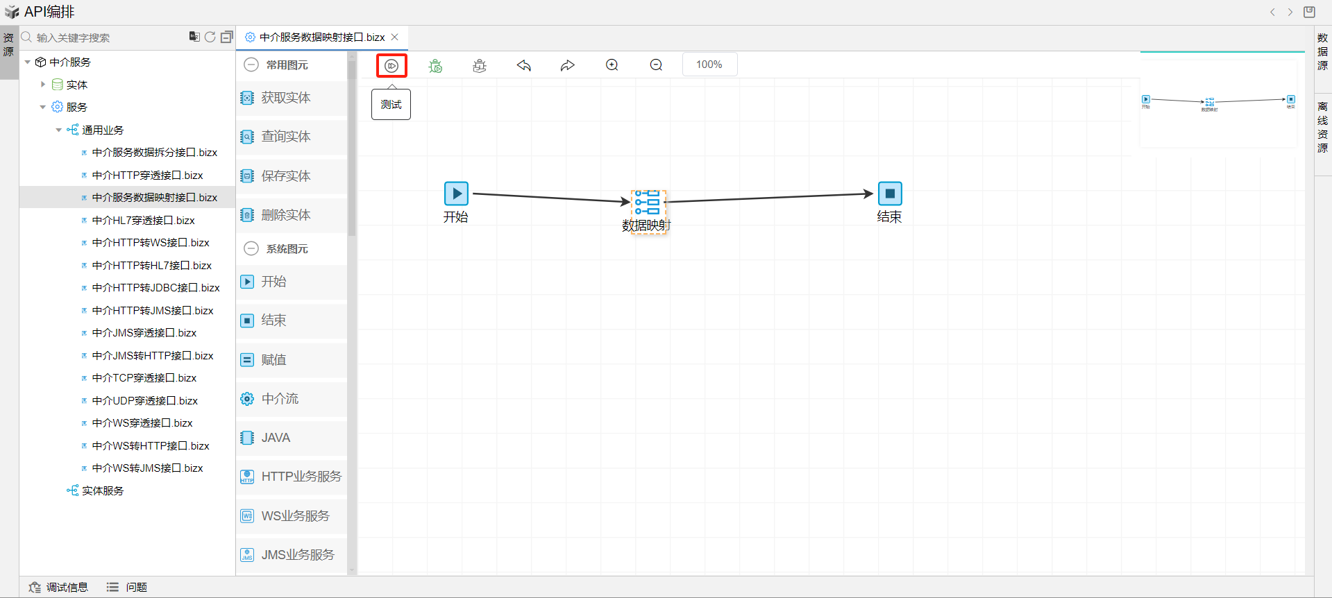 1. 在线编排页面保存成功后,点击界面上方的测试按钮,如下图: