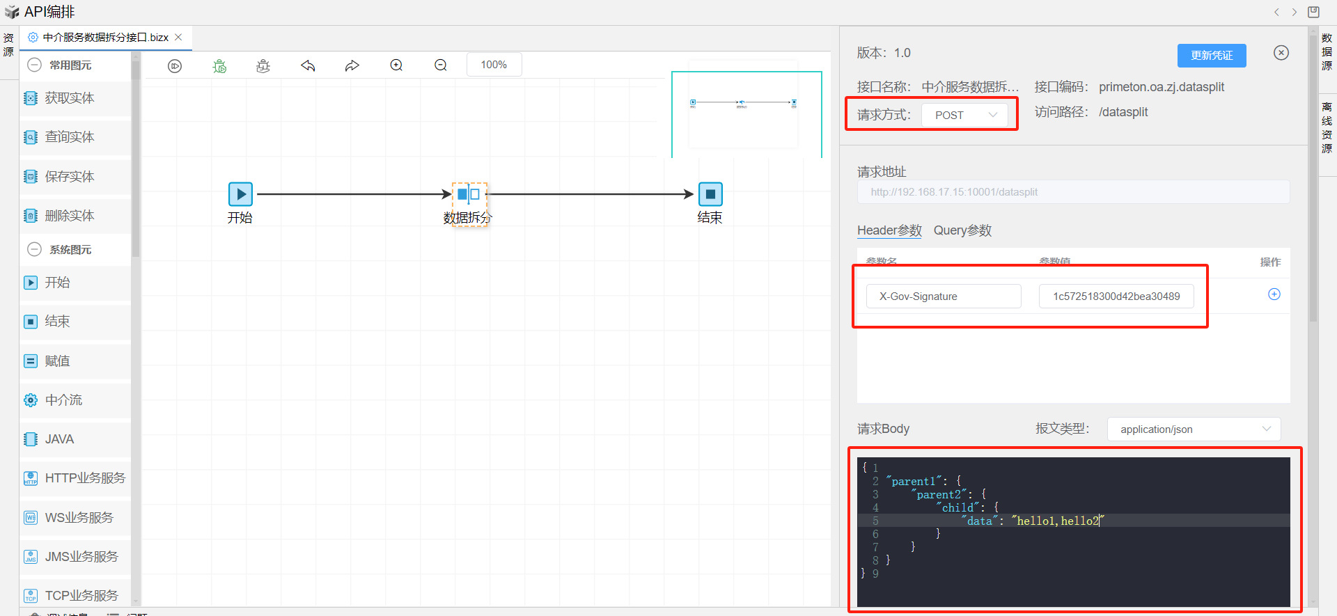 打开测试对话框,body体填写拆分前原报文格式文件的内容。如下: