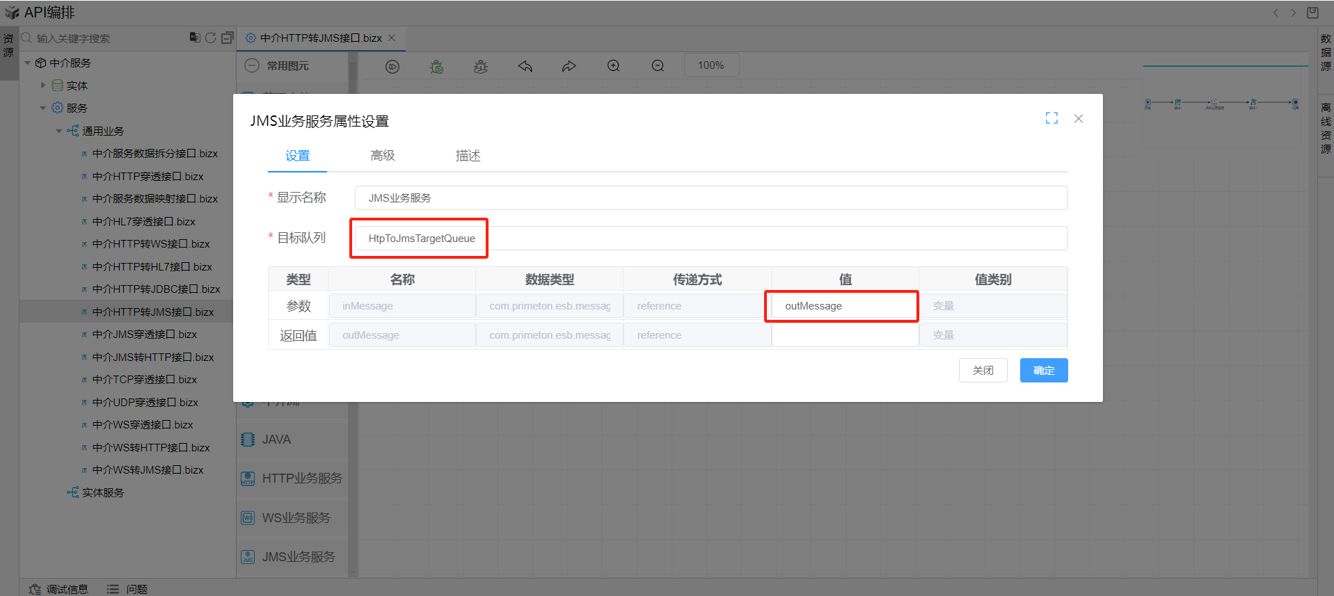 双击打开JMS业务服务图元,填写目标队列名称HttpToJmsTargetQueue,填写参数为OutMessage,返回值不填然后点击确定。如下图: