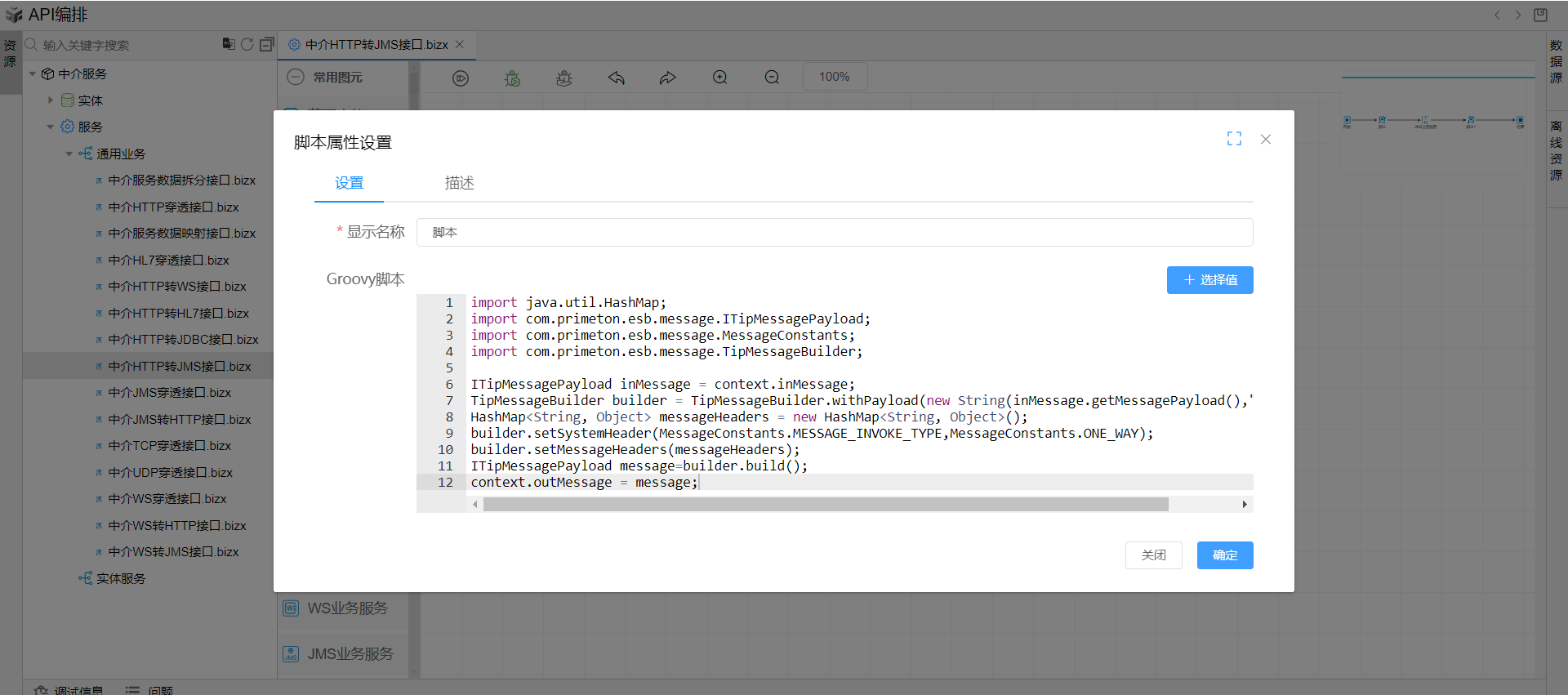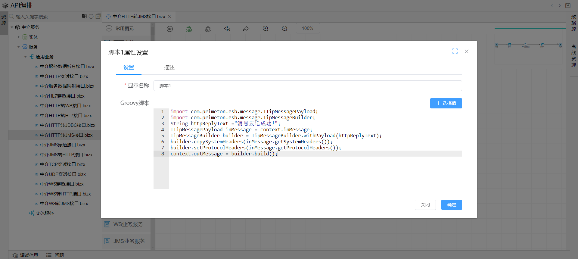 双击打开第一个脚本图元,将文件中http2jms脚本-1.txt的内容,复制到脚本图元中后点击确定。如下图: