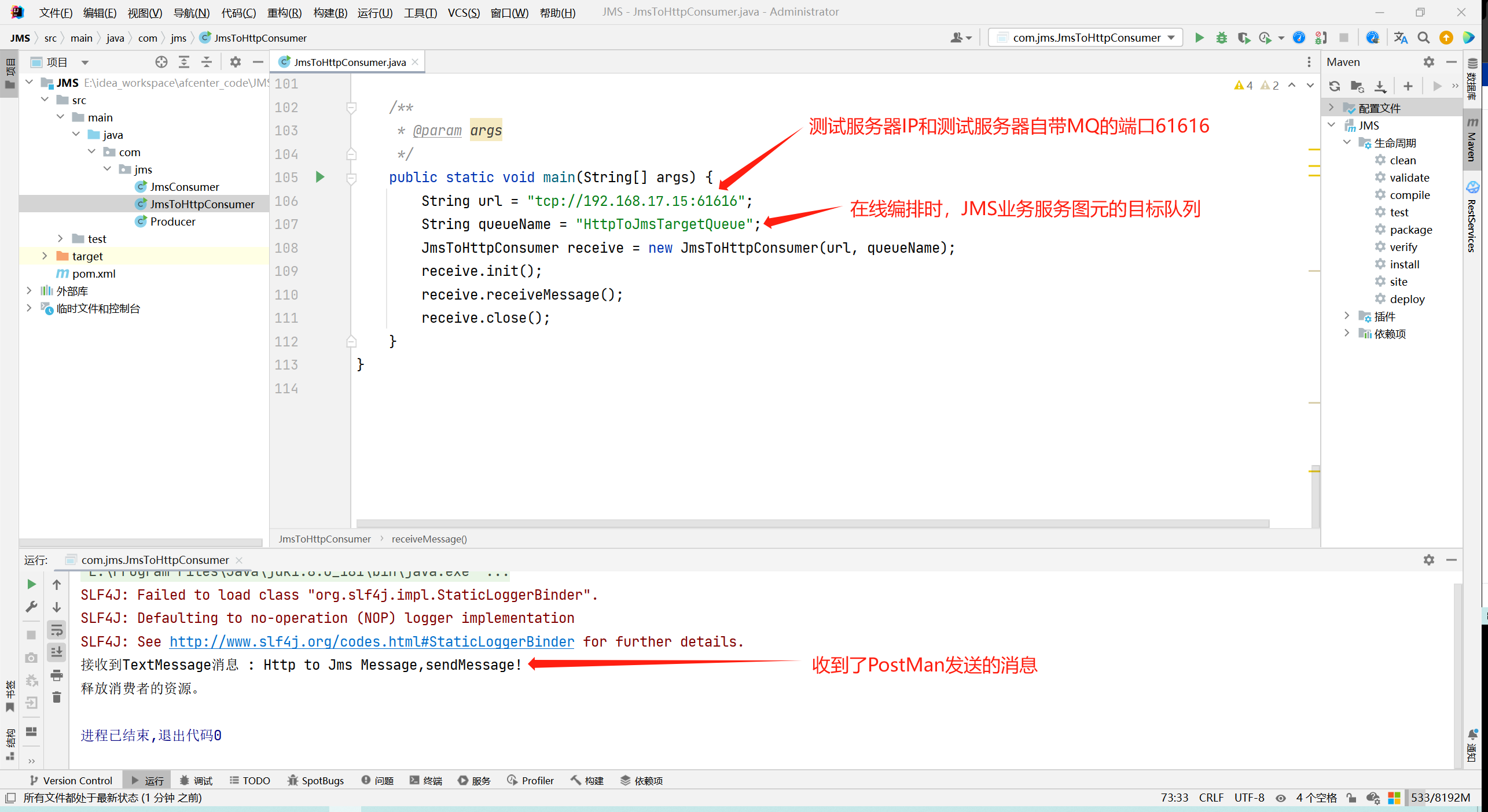 发送消息后下面使用Java代码调用,JMS.zip,下载后使用开发工具打开。 调用JmsToHttpConsumer类的Main方法接收消息,ip为测试服务器IP,端口为61616端口,queueName值为服务编排时,JMS业务服务图元中,填写的目标队列HttpToJmsTargetQueue,然后执行Main方法。如下图: