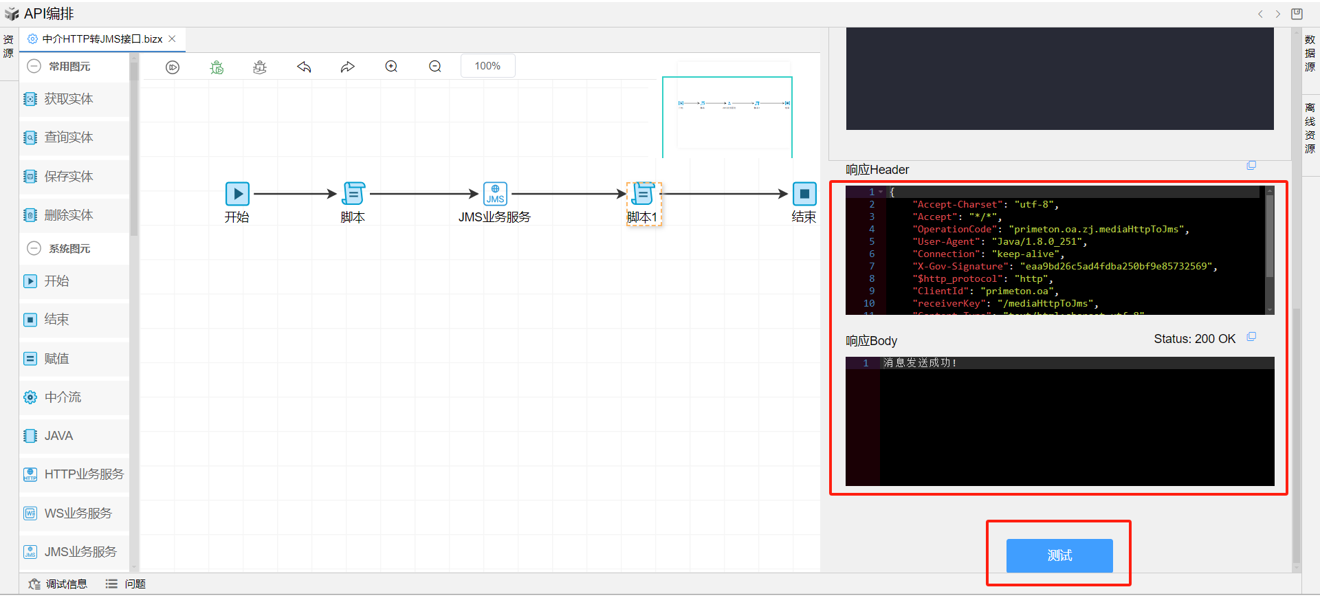在线编排页面保存成功后,点击界面上方的测试按钮,如下图: