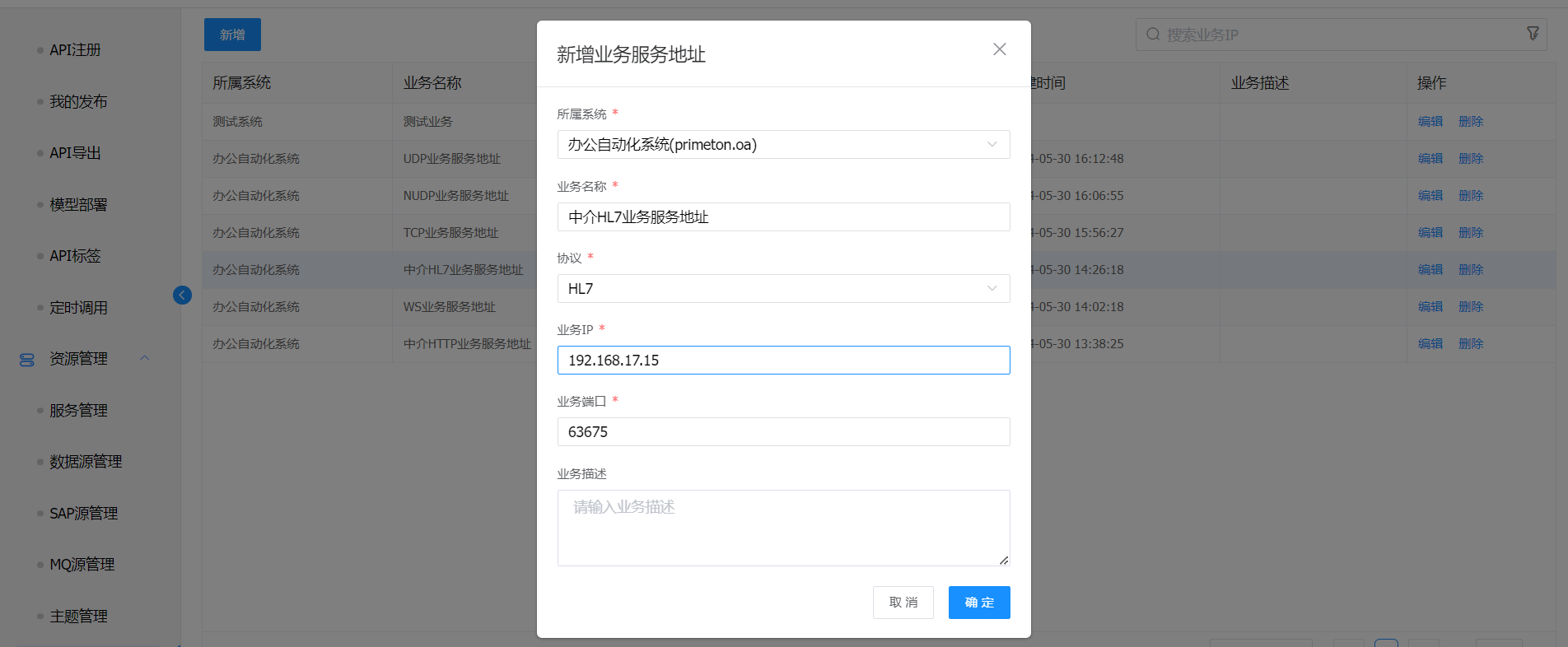 3. 在【资源管理】/【业务地址】页面,新增业务服务地址并点击确定保存。(如果已经创建过,则请忽略此步骤)如下图: