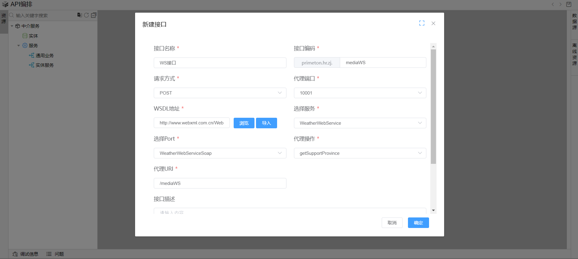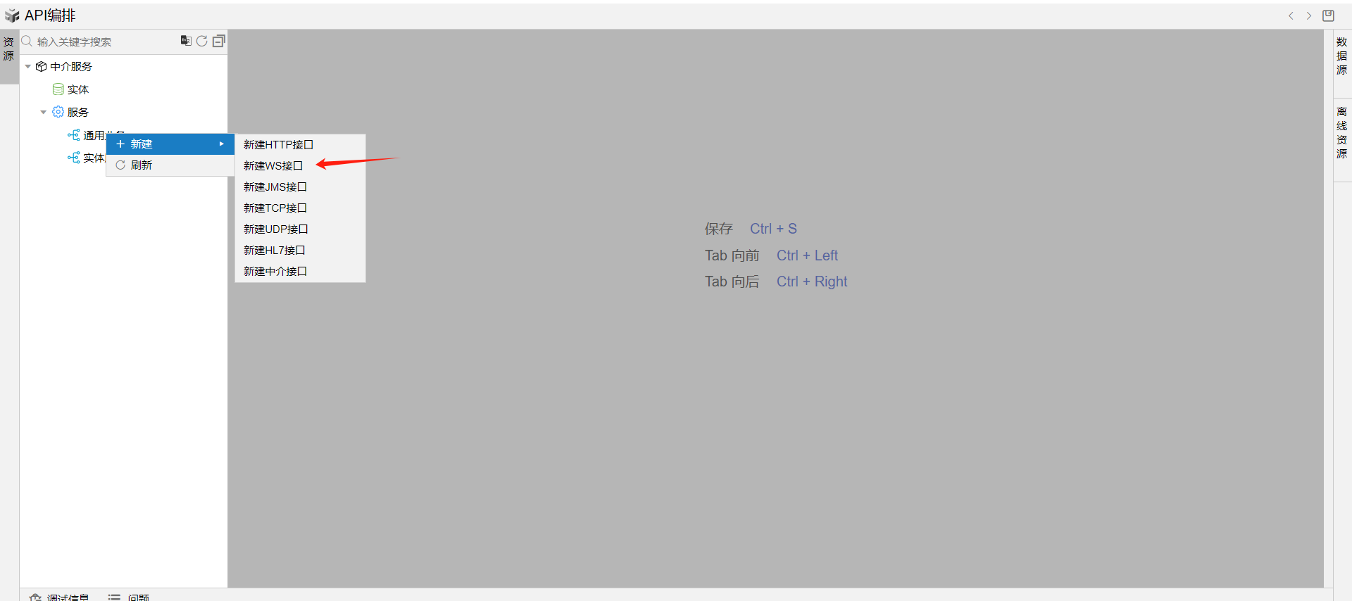 在线编排页面中,在通用业务目录上点击右键并点击新建,点击新建WS接口,然后如下图所示填写数据并点击保存确定。