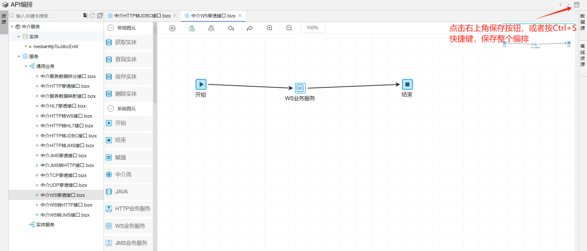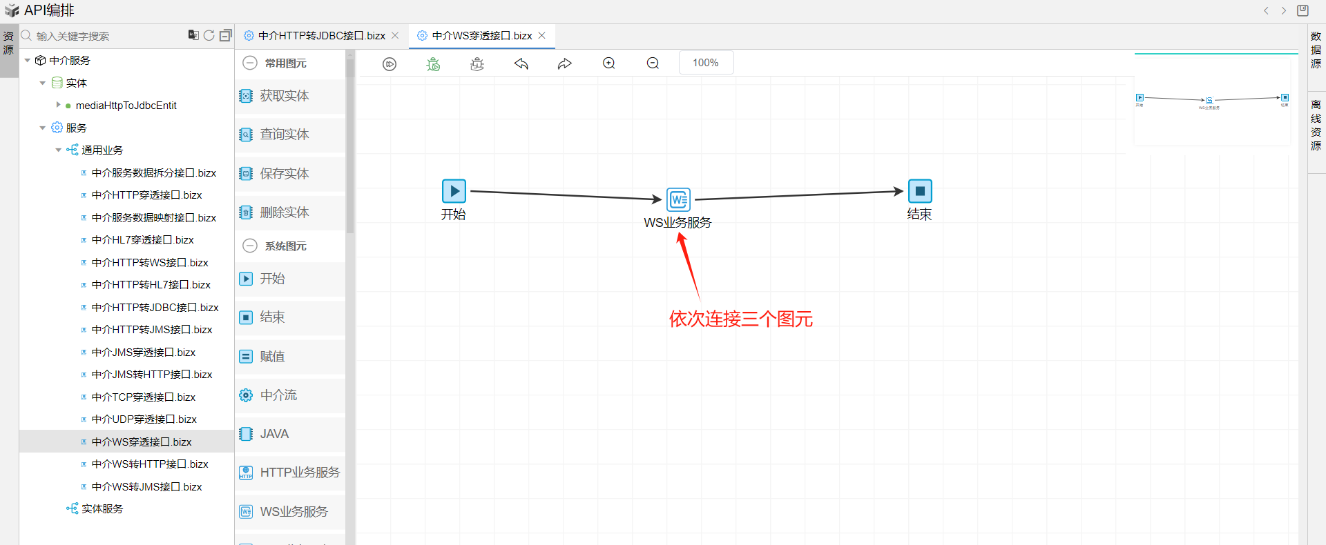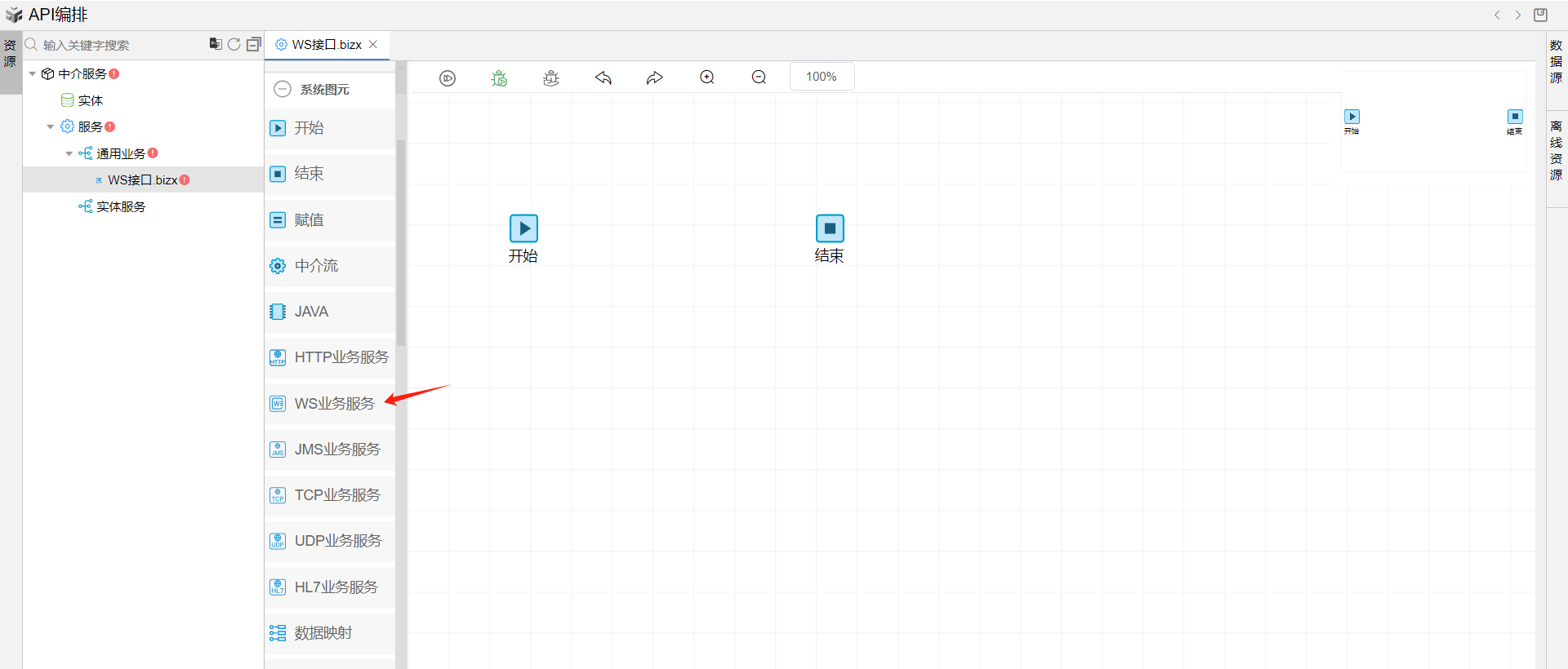 保存成功后系统自动打开中介编排页面,如下图所示。从左侧拖一个WS业务服务图元到开始和结束图元中间并依次连接各个图元。如下图: