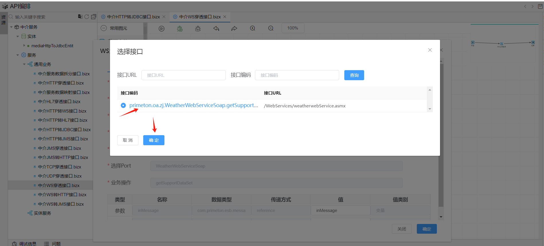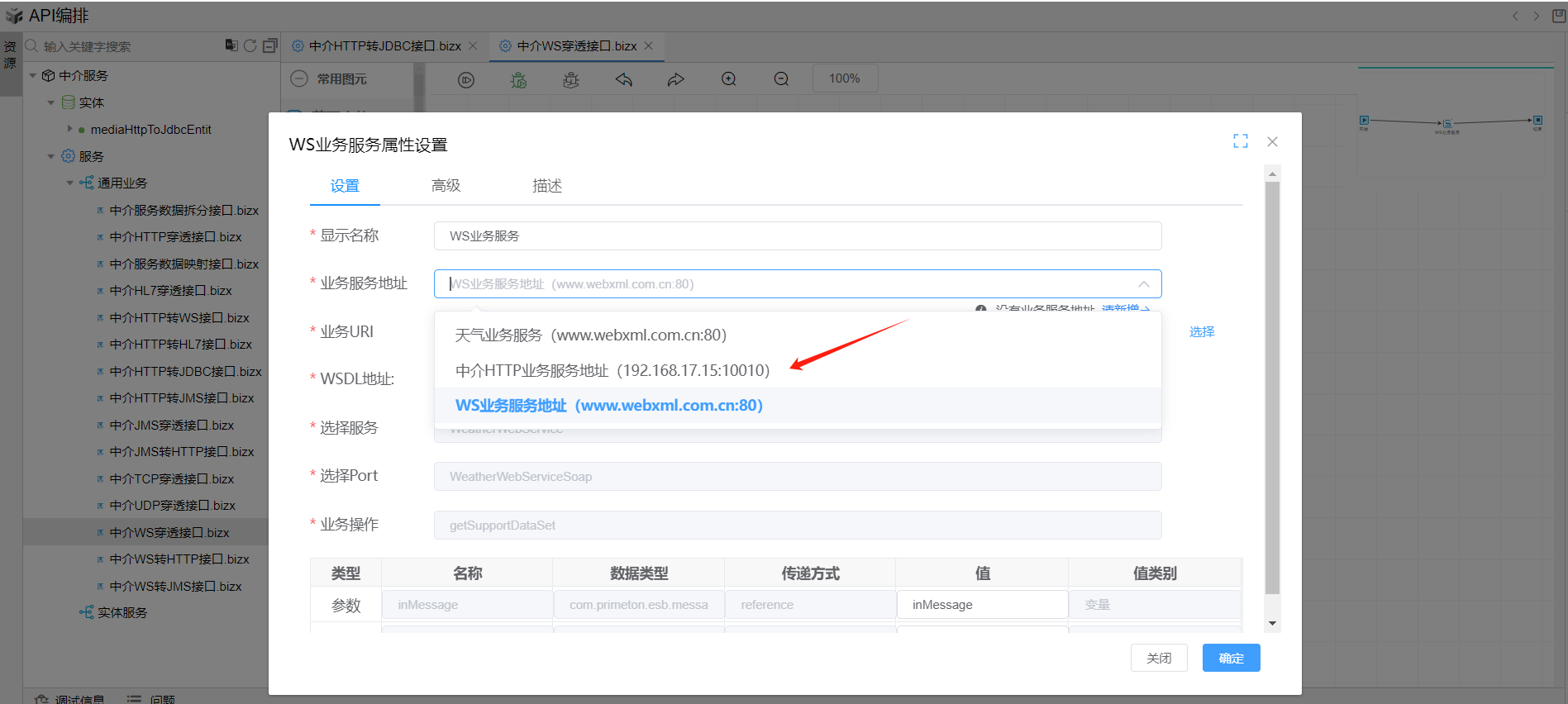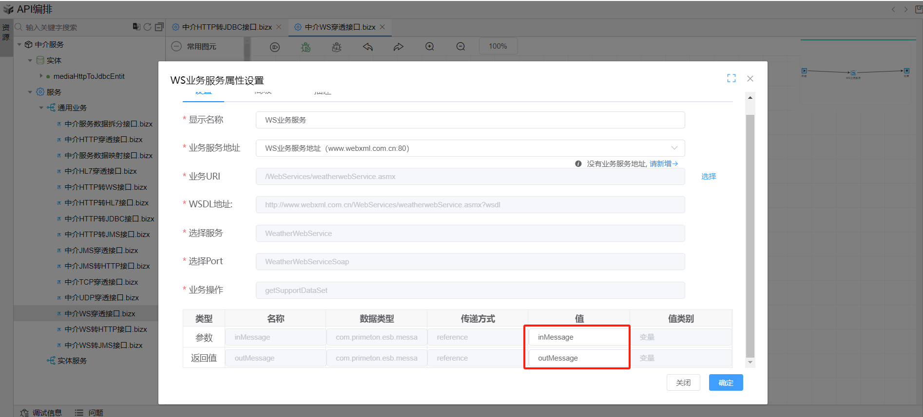 双击打开WS业务服务图元,业务地址下拉框选择中介WS业务服务地址,业务url选择我们在wsdl导入时导入的接口,下方表格中的参数和返回值分别选择inMessage和outMessage,然后点击确定按钮关闭对话框。如下图:
