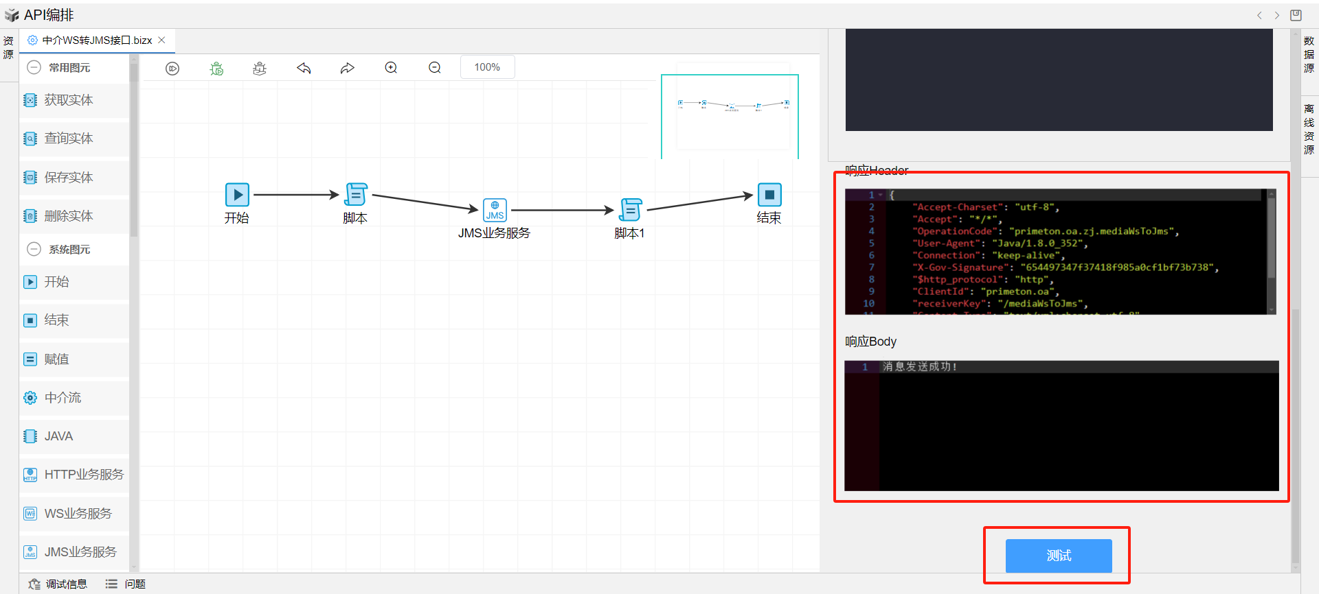 1. 在线编排页面保存成功后,点击界面上方的测试按钮,如下图: