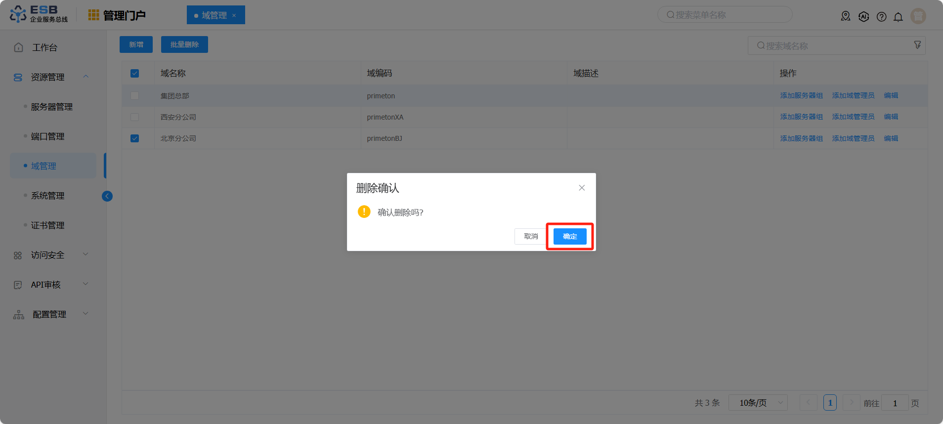 在“域管理”页面,选择需要删除的域记录,点击操作列”批量删除“按钮“,弹出删除确认框。
