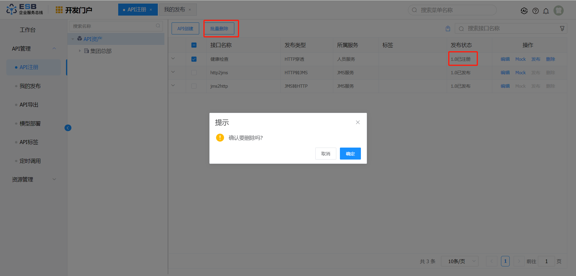 在“API注册”界面,选择左侧组织树中API所属节点,选中需要删除的API接口,点击“批量删除”按钮,弹出删除确认界面 (已发布接口需取消发布并删除发布记录后才能删除,待发布的接口需在我的发布菜单栏删除发布记录后才能删除)。