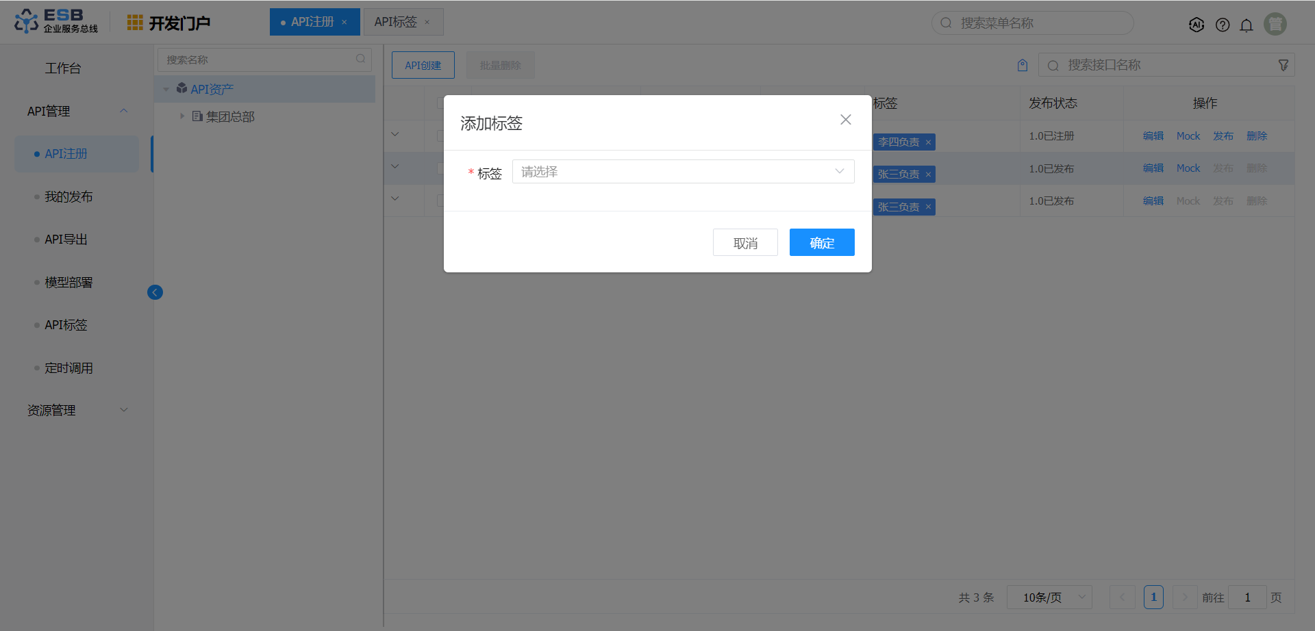 在“API注册”界面,选择左侧组织树中API所属节点,点击标签查询按钮,选择标签,点击“搜索”图标,显示符合条件的API接口列表。