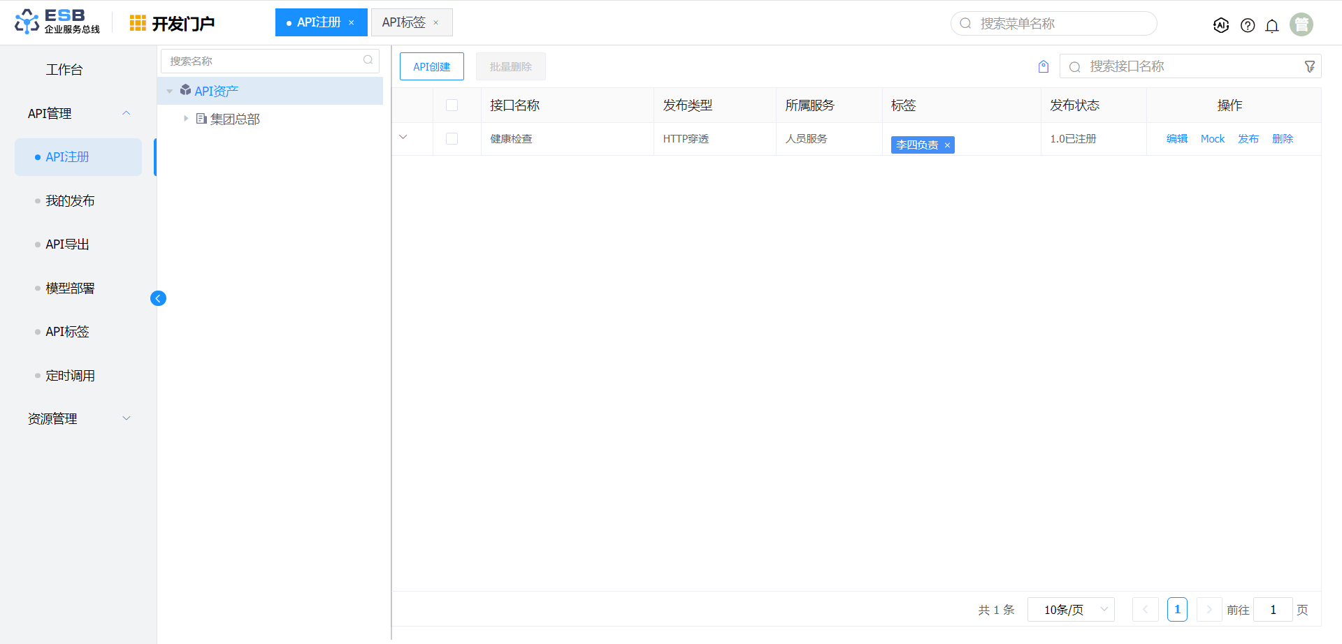开发人员登录系统,进入开发门户,点击菜单“API管理”>“API注册”,打开API注册管理界面,左侧显示组织树结构(包括域、系统、服务),右侧显示已创建的API列表。