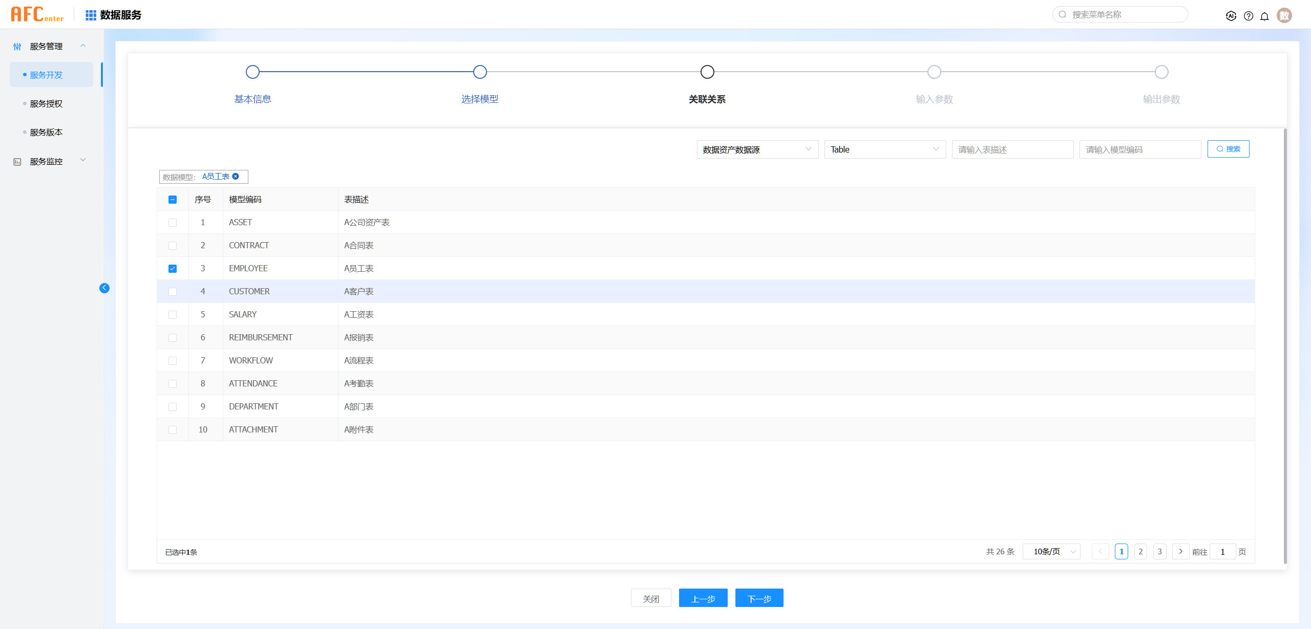2) 第二步“选择模型”,用户选择开发服务相关的模型信息,只能选择一个。