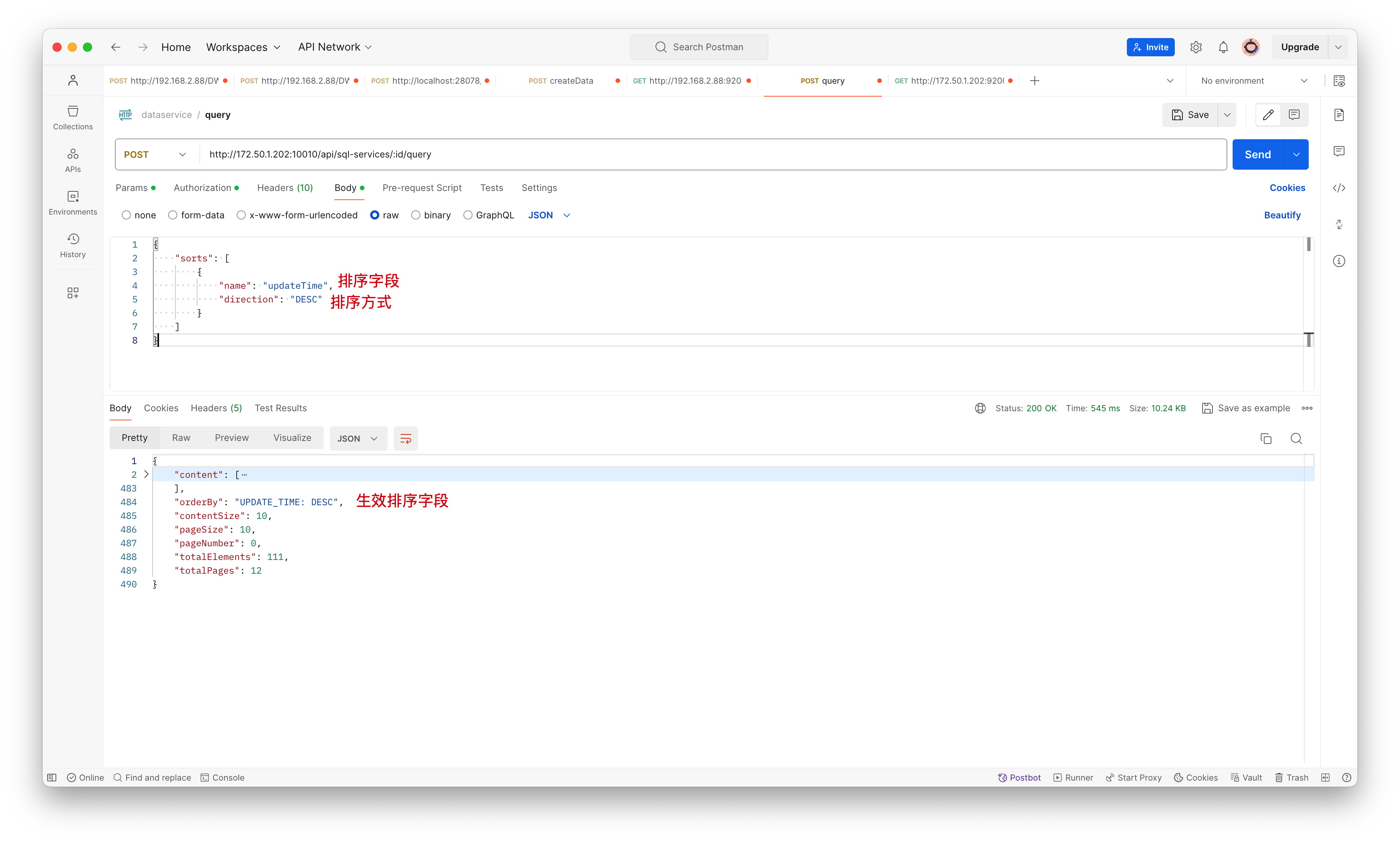 实现排序需要使用参数 sorts,而且由于排序参数较为复杂只能使用请求体构建