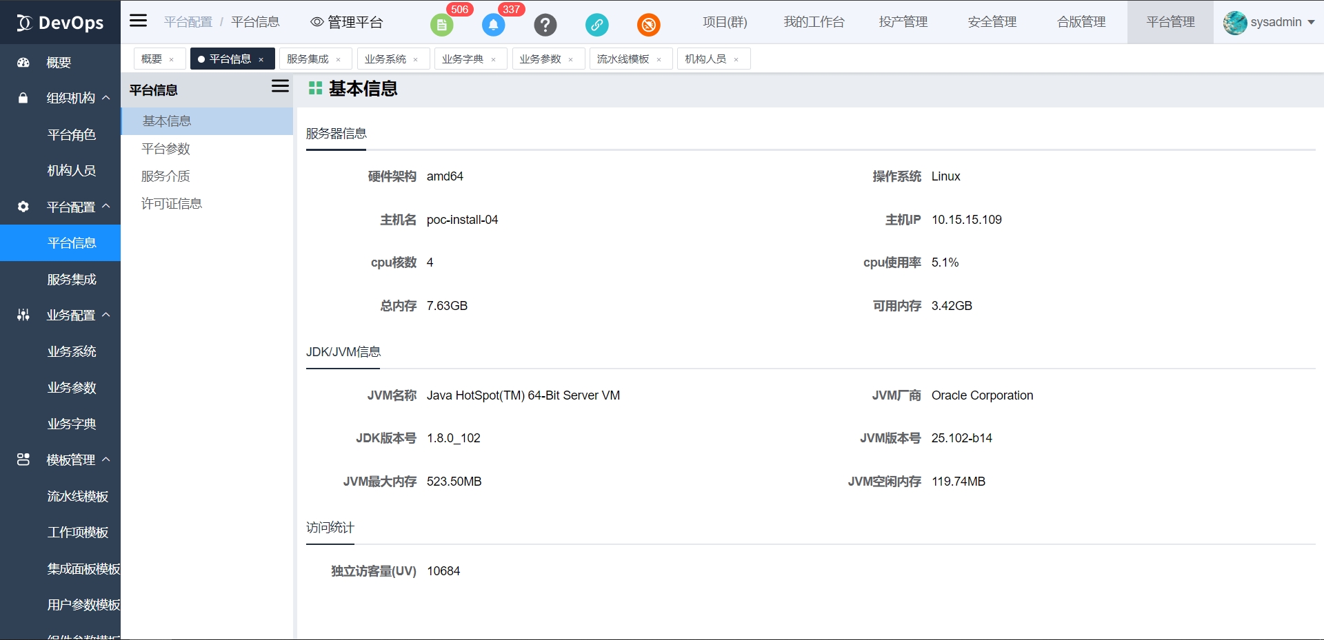 查看当前 DevOps 服务的所属服务器、JVM 以及访问统计信息。