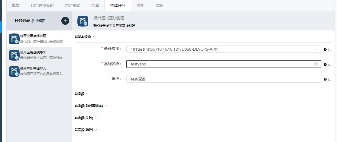 EOS8.3.2版本开始,创建低开应用基线为同步接口,不在是异步接口(响应完成但是实际业务逻辑运行未知),所以基于8.3.2版本以及之后的版本,我们可以在同一条流水线实现低开应用基线的创建与导出。