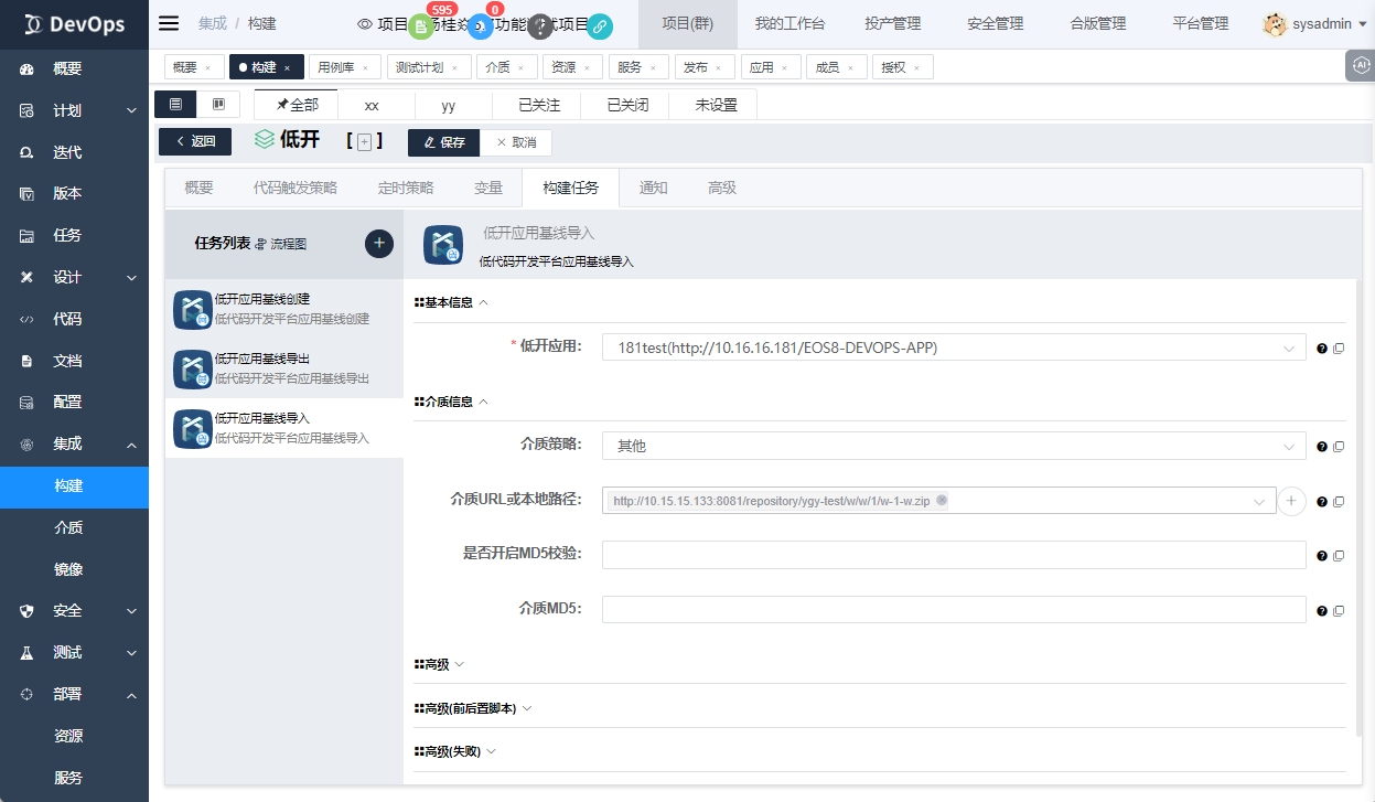 可以通过介质上传,将刚刚导出的zip包手动上传到devops平台中。或者在导出下方新建个介质上传原子任务。