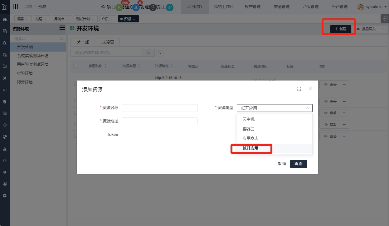 部署》资源》点击新建按钮,选择【低开应用】资源类型