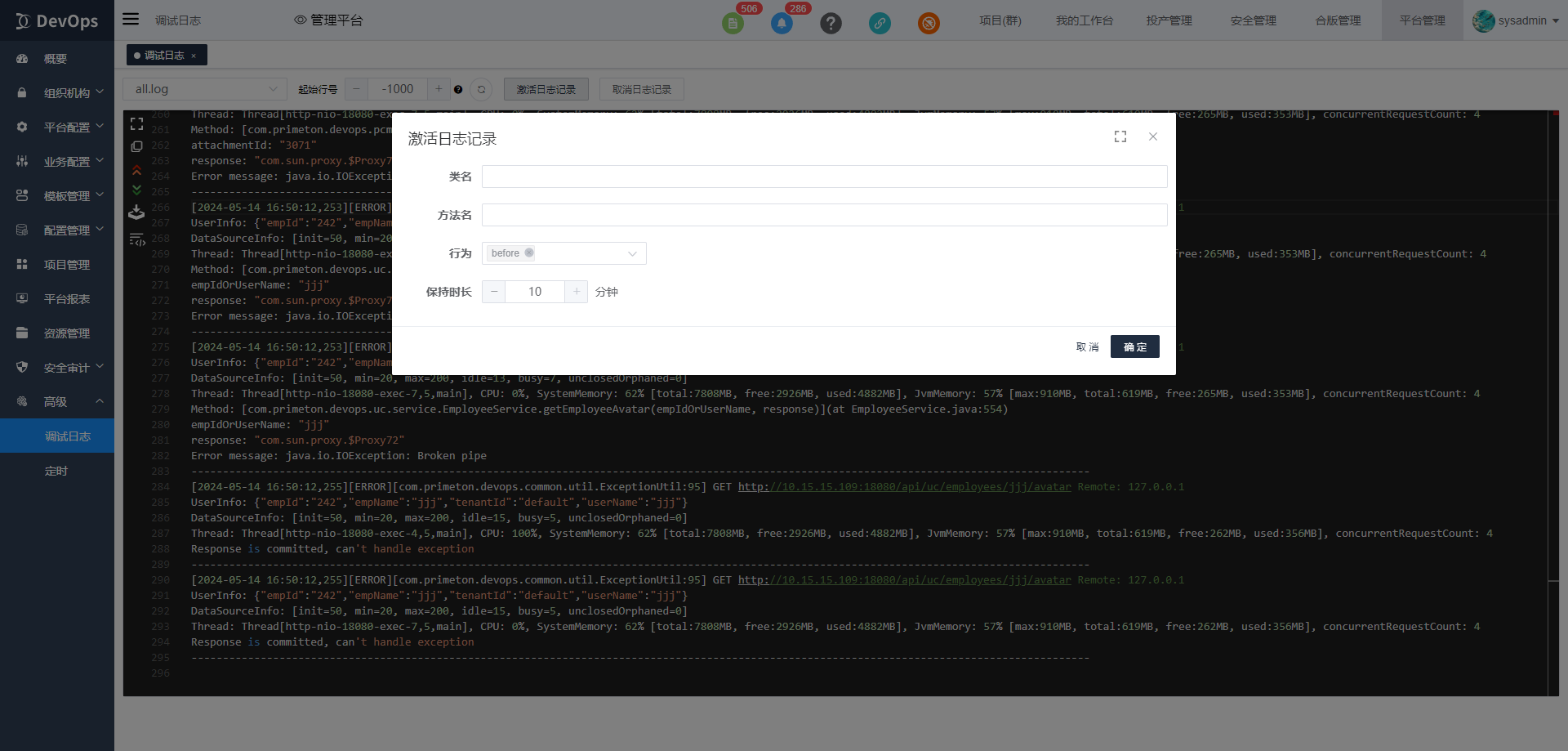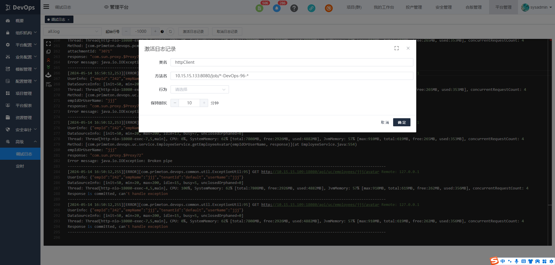 通过如下配置,可以激活http-client.log日志记录,在10分钟的期限内,打印满足'10.15.15.133:8080/job/-DevOps-96-'条件的http请求日志数据。