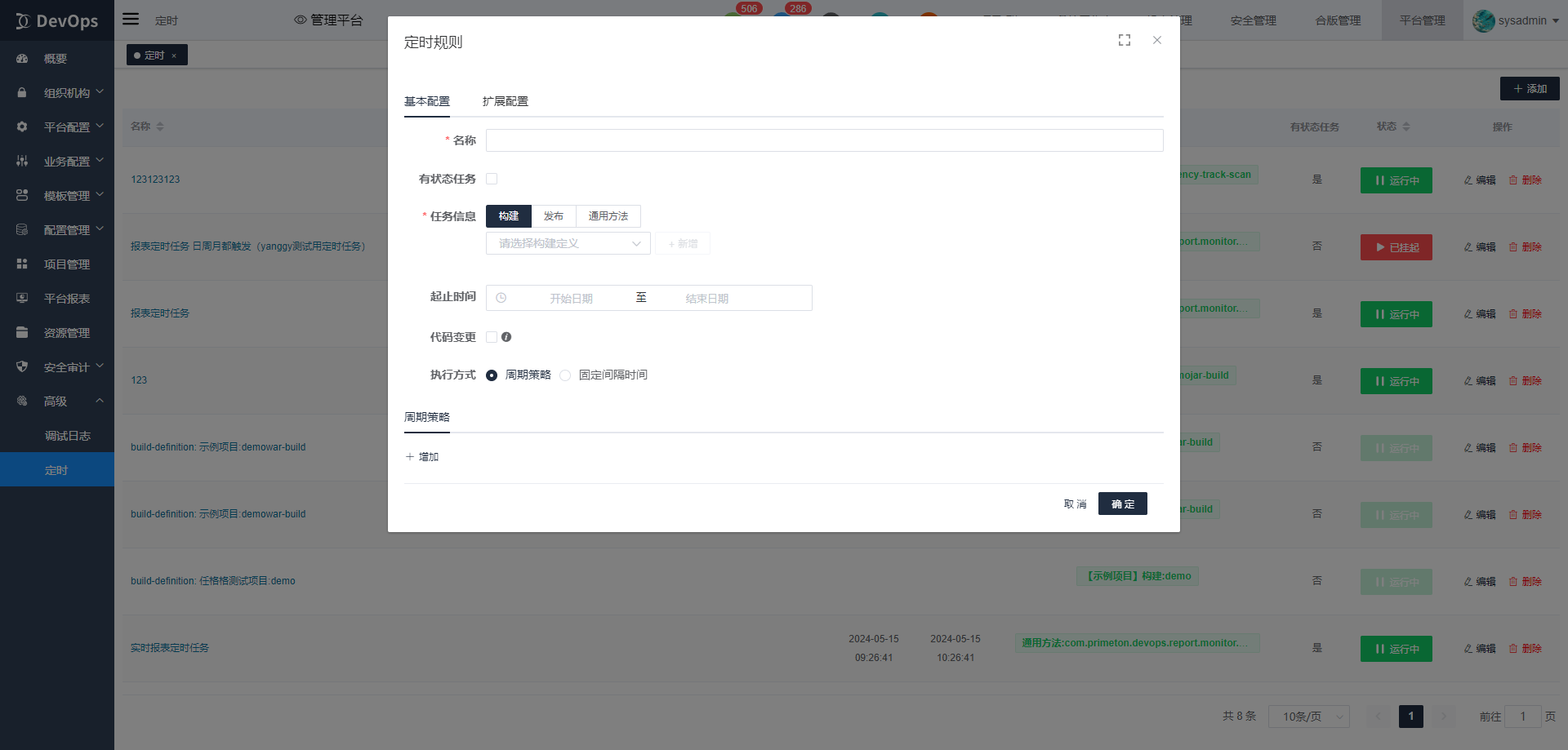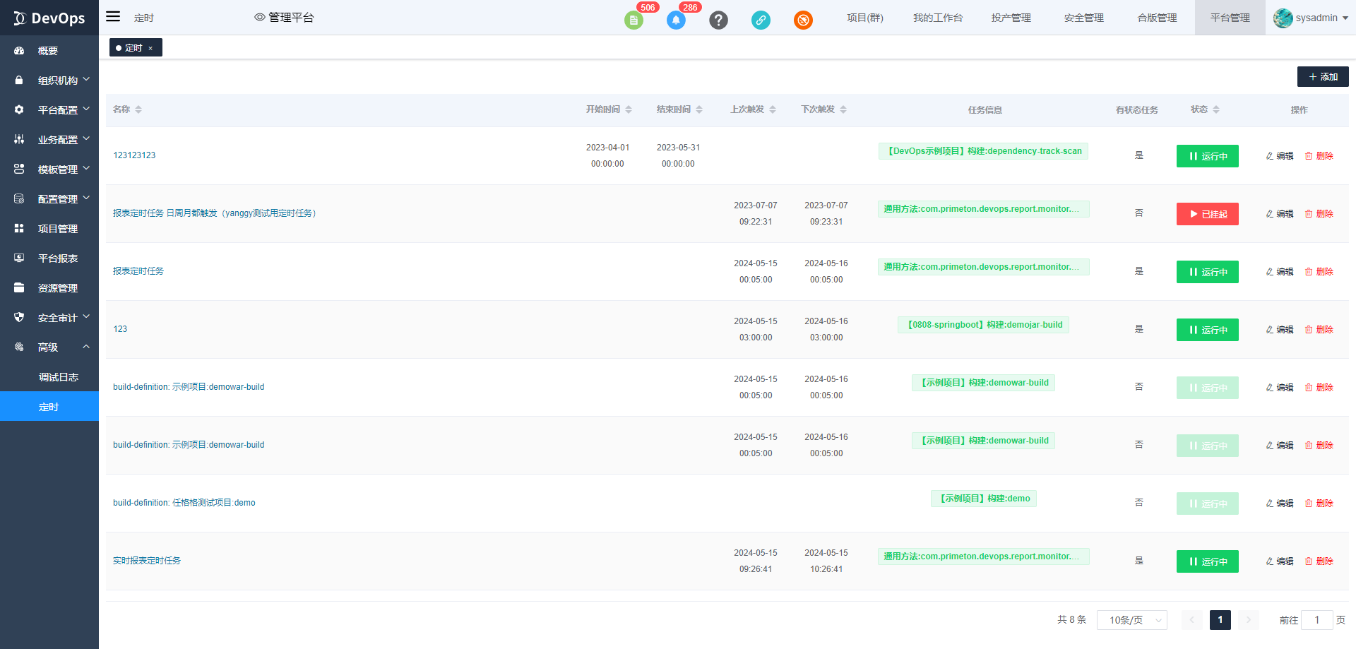 DevOps平台提供定时任务集中管理页面,支持添加、挂起、恢复、编辑、删除定时任务。