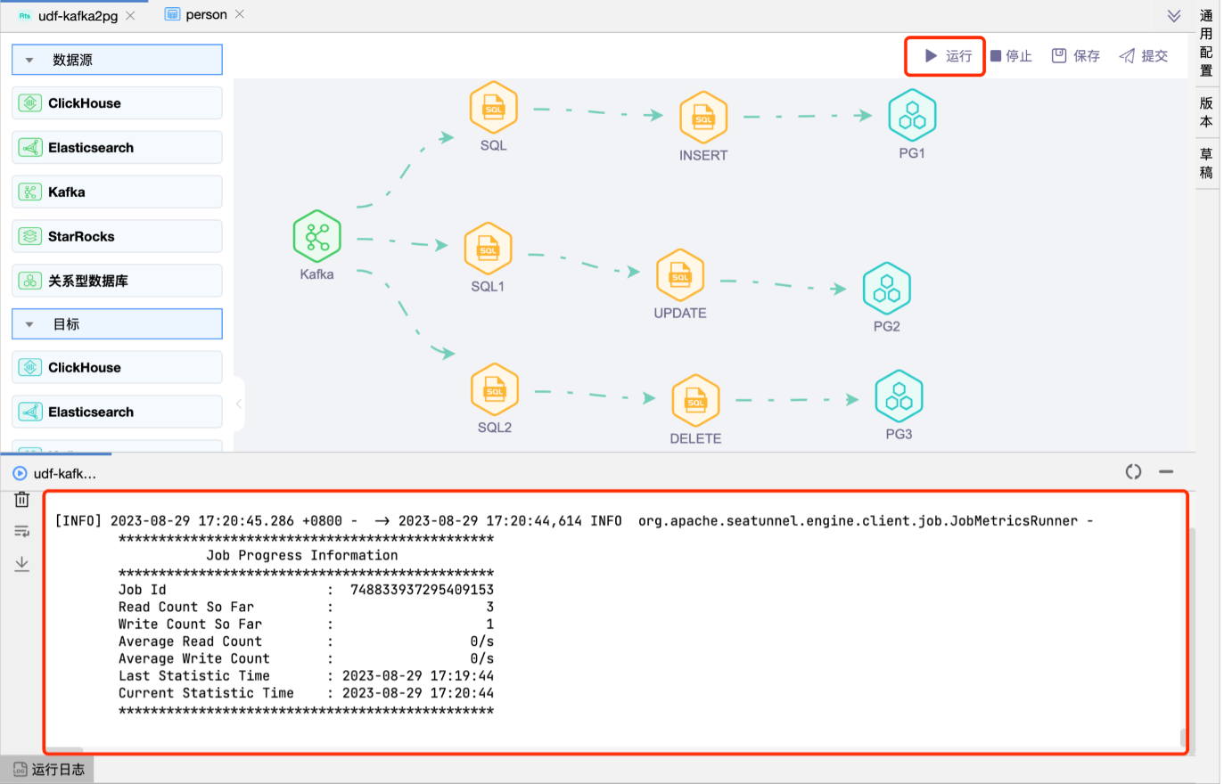 本示例主要介绍 Kafka 到 PostgreSQL 的数据同步示例场景开发,该场景根据 Kafka 接收到的消息内容向 PostgreSQL 数据源的表 person 分别执行 INSERT、UPDATE、DELETE 的操作。主要步骤如下: