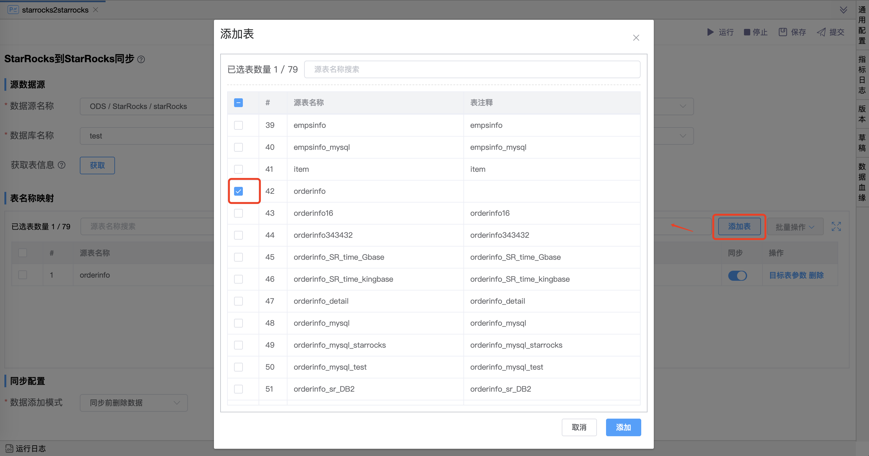 - 点击【添加表】,在弹窗中选择将要同步的源表名称。