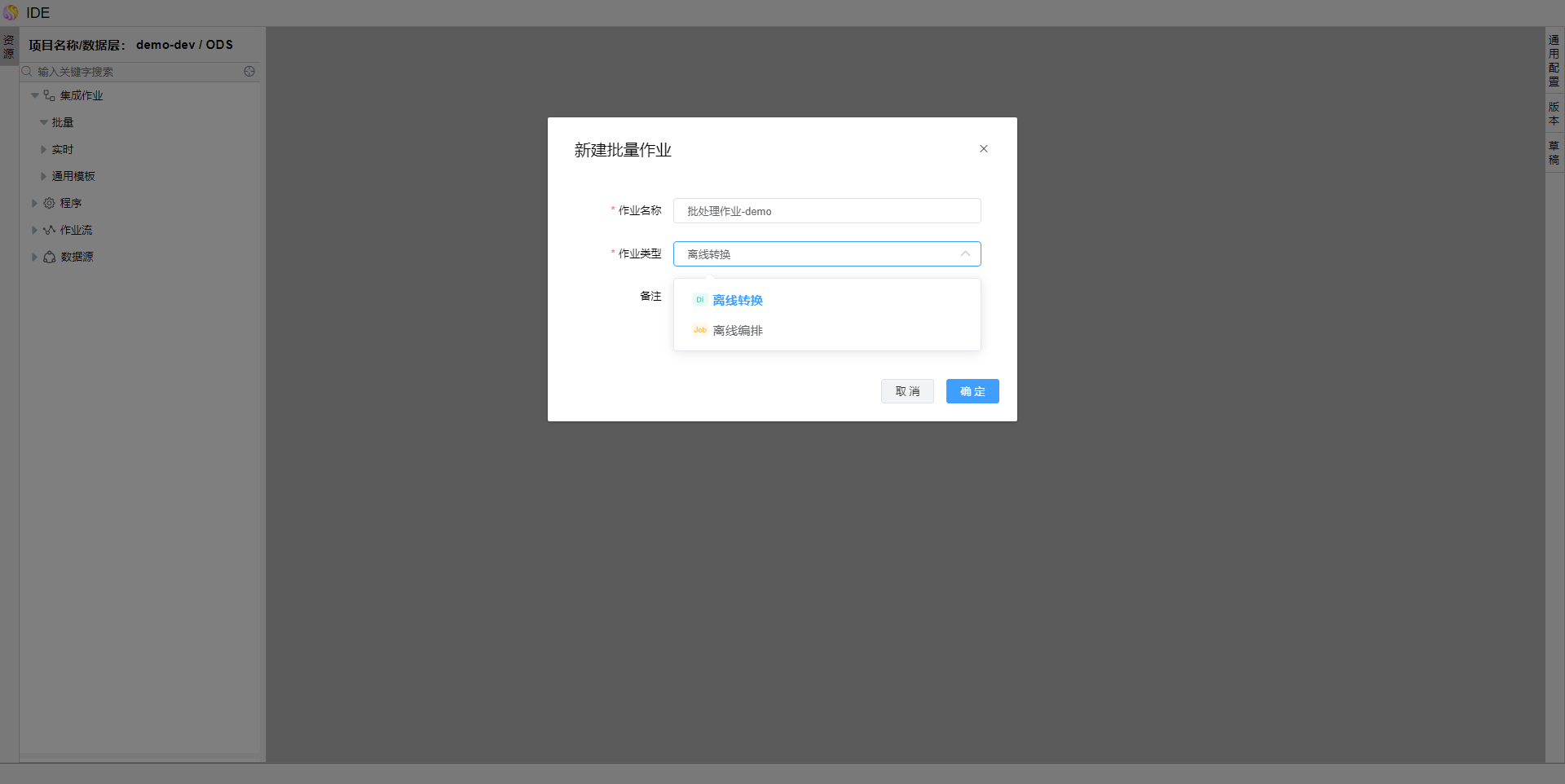 在弹出的【新建批量作业】页面,输入作业名称、选择作业类型为离线转换,点击确定按钮。