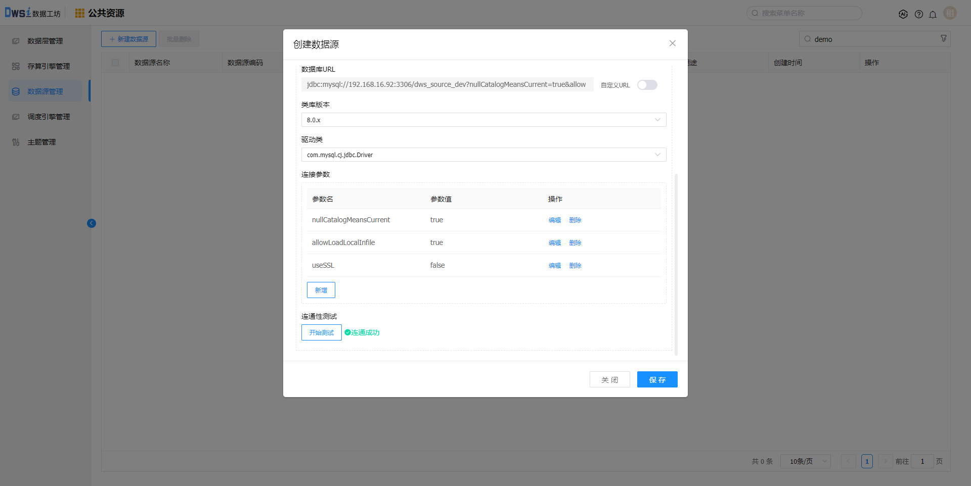 配置【开发环境】数据源信息,测试连接成功后,点击保存数据源。