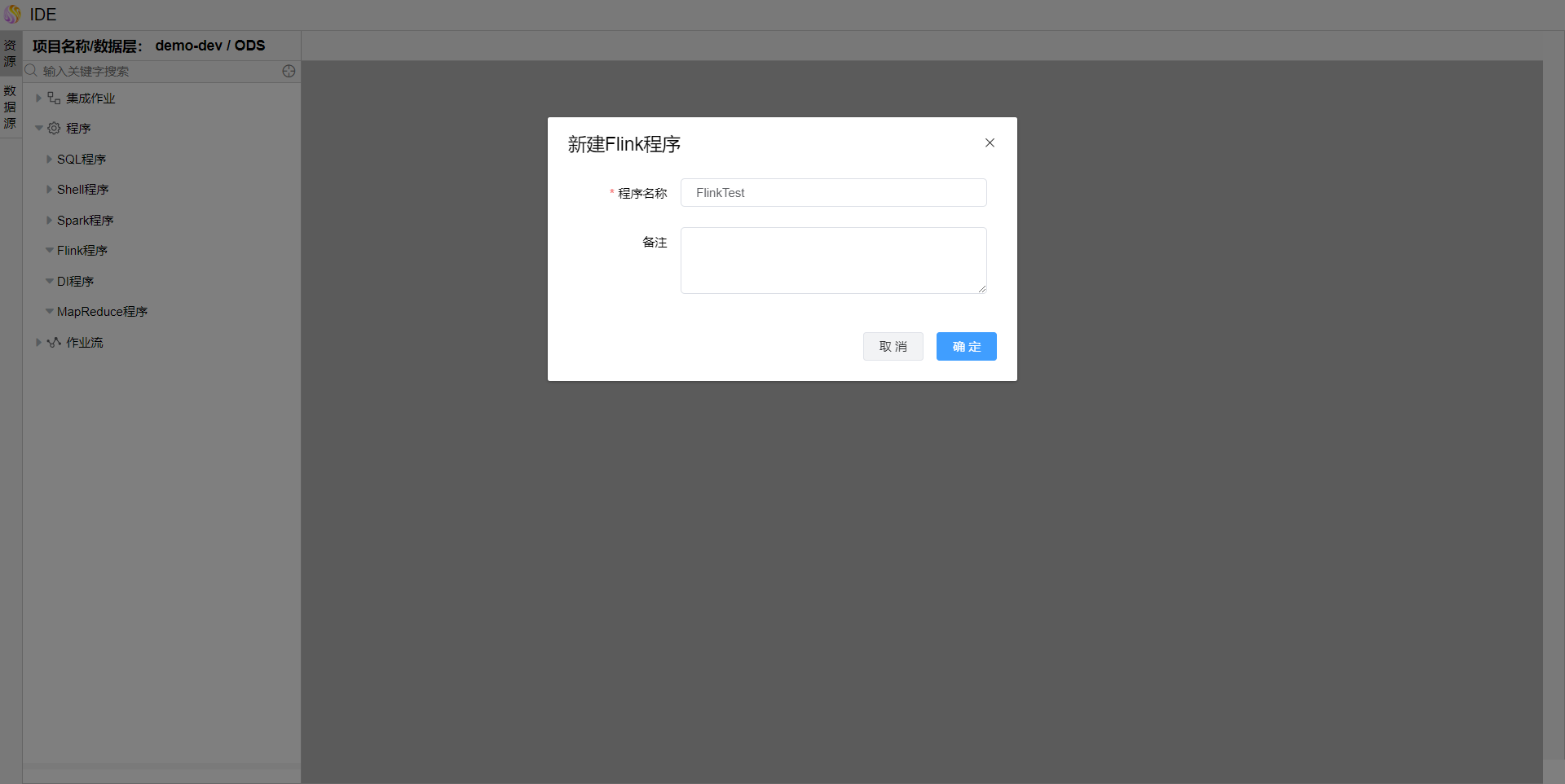 点击资源树"Flink程序"节点上的【...】,选择弹出菜单【新建Flink程序】,填写"程序名称",点击【确定】按钮。