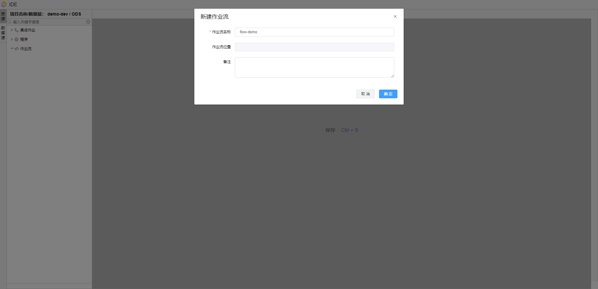 2. 在【作业流】节点点击...,点击【新建作业流】,输入作业流名称并保存。 image-20240514110424507