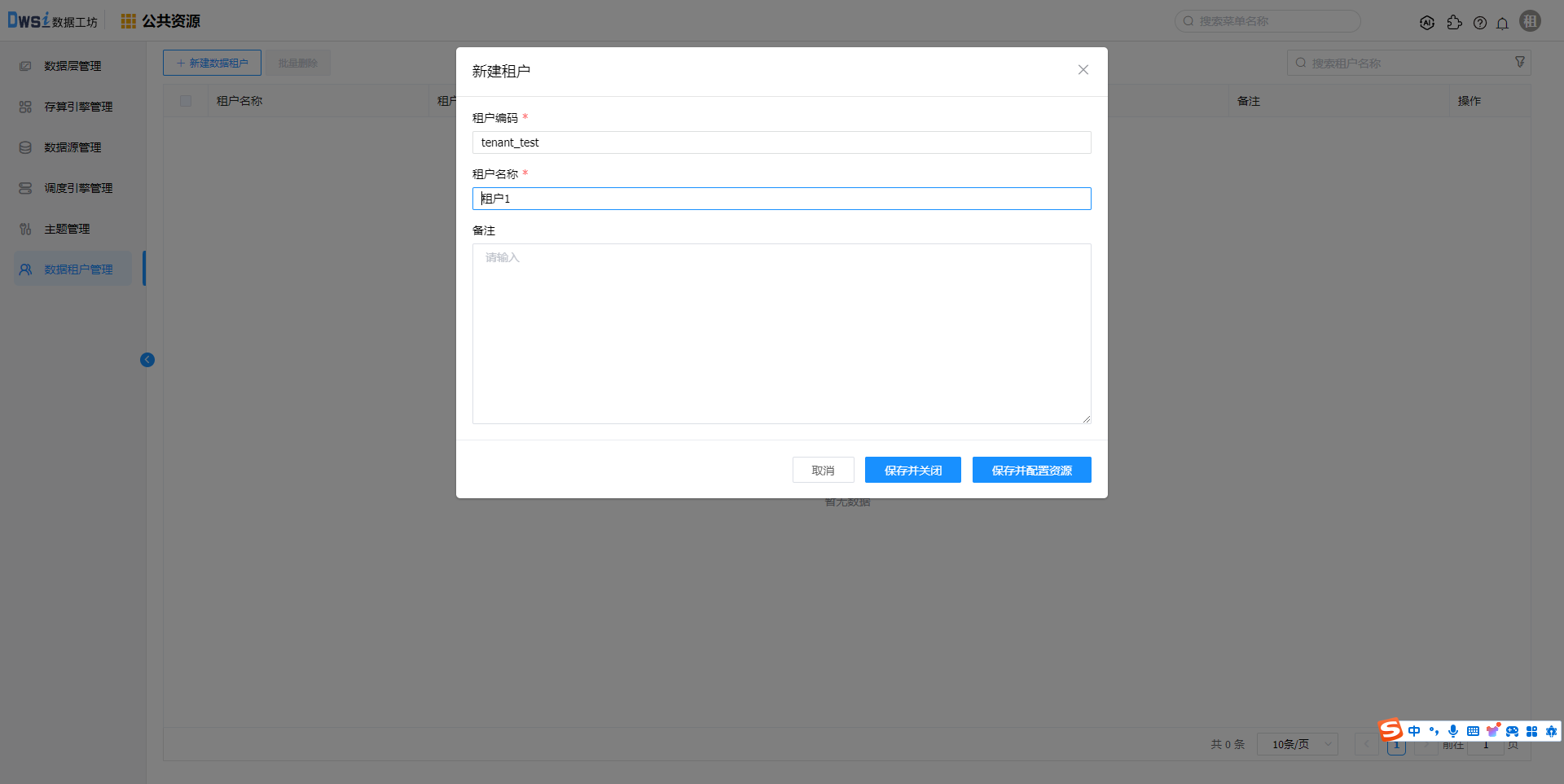 在弹出的新建租户框中,输入“租户编码”和“租户名称”,点击【保存并配置资源】
