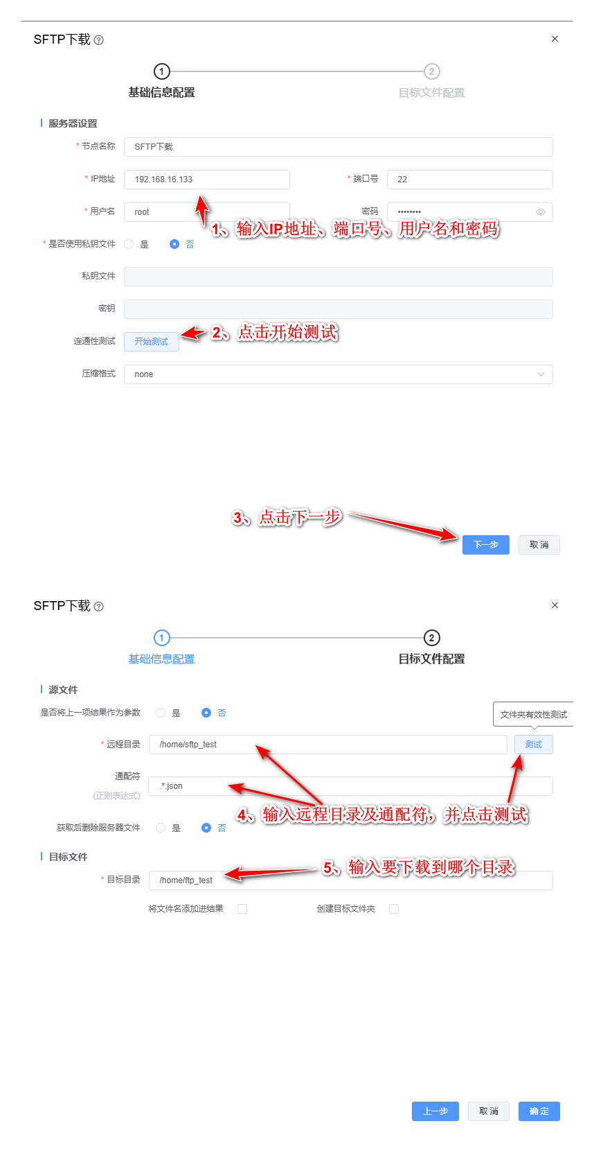 3、双击"SFTP下载"组件,根据下图所示步骤依次配置。