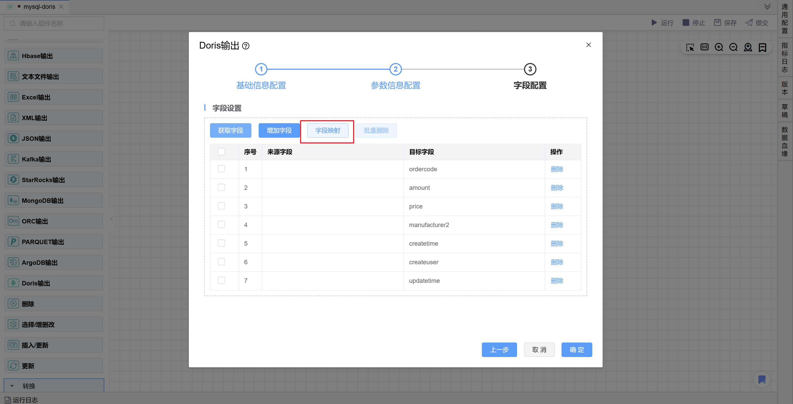 手动映射:需要手动选择来源字段,目标字段进行映射匹配。 自动同名映射:名称相同的字段会自动添加到下方的映射关系中。 重置映射:清楚下方映射关系。